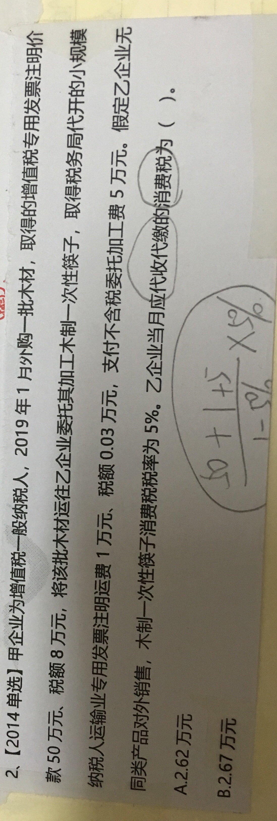 因为这里的分子50+1+5是不包括消费税的成本,而消费税是“价内税”,即价款应该含消费税。所以需要除以1-5%得到“价款”,再乘以5%得到消费税哈。