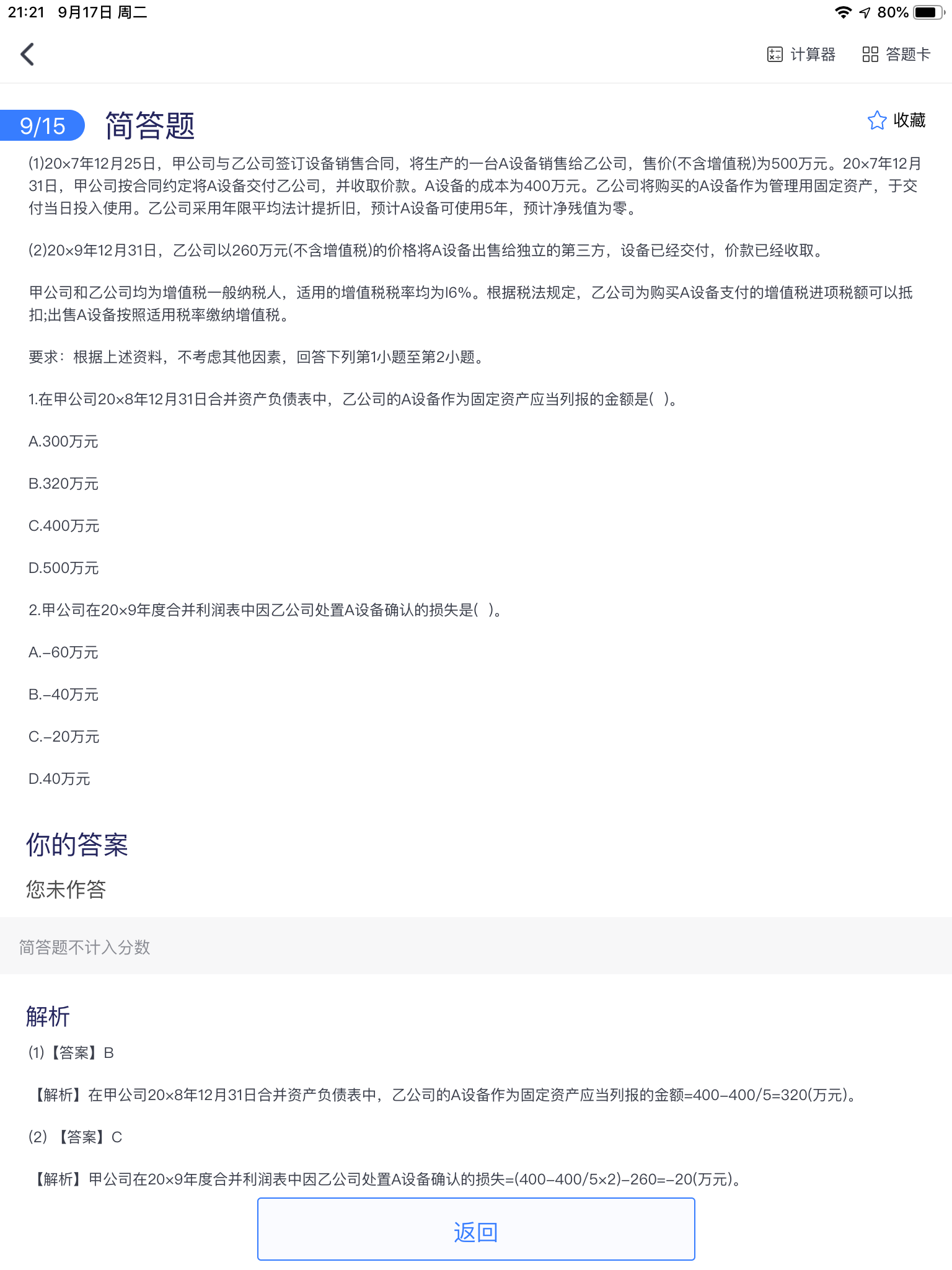 第一问问的是合报中,设备应该列式的金额,设备是母子公司的交易,这个交易合报是不认可的,所以从合报的角度,来说,这个设备依然是以400为基础计提折旧的。个报中固定资产是按照500为基础计提折旧,合报固定资产是按照400为基础计提折旧。
