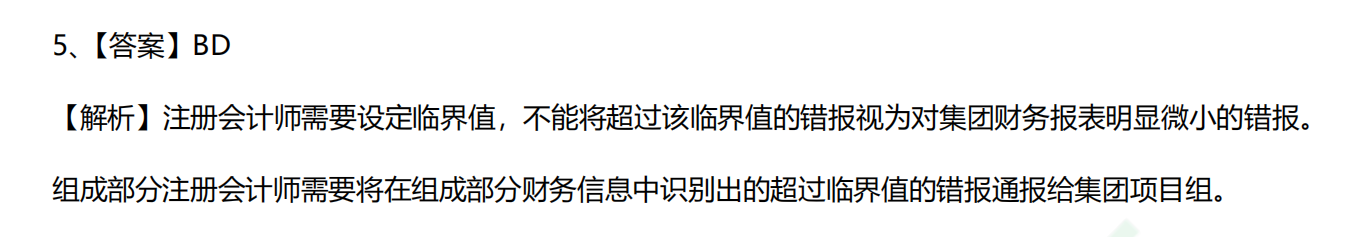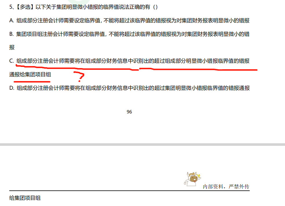 老师,C选项,组成部分注册会计将超过组成部分明显微小错报临界值的错报通报给集团项目组不对吗?它已经超过明显微小错报了呀,还是说因为是要报给集团项目组的,所以要按照集团项目组来判断?