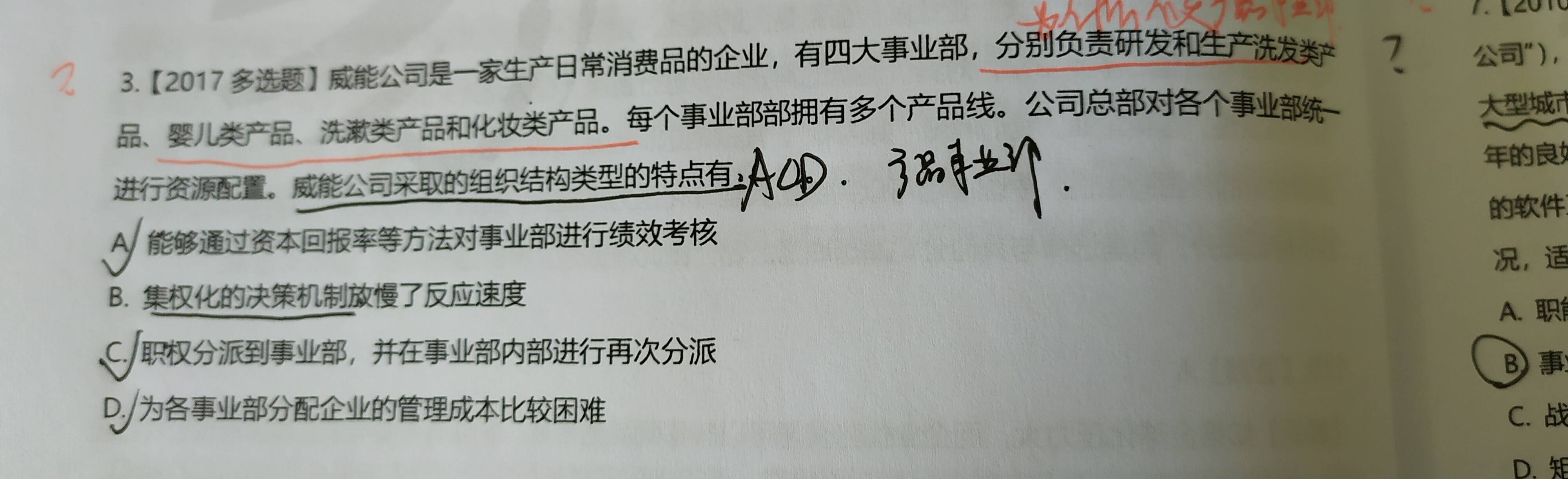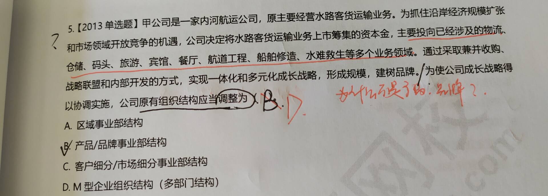 老师,我不太明白,第三题明确提到了洗发类 婴儿累…产品,为什么不是产品事业部结构 而是M型 第五题 也说了涉及多个业务领域,为什么不是产品品牌事业部,而是M型
