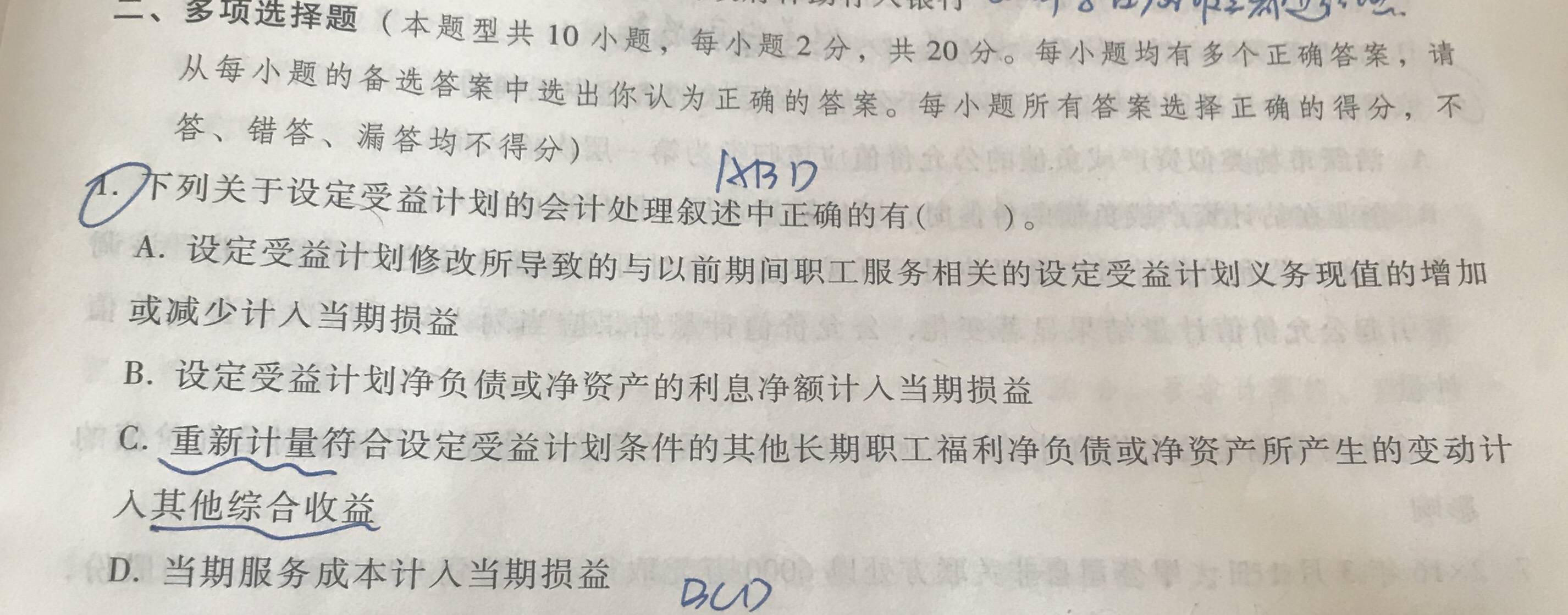 如果是离职后福利中的重新计量设定受益计划的净资产净负债的变动,我们是计入其他综合收益的,C选项中的设定受益计划是其他长期职工福利中的内容,这块我们是简化处理的,都是直接计入当期损益的。