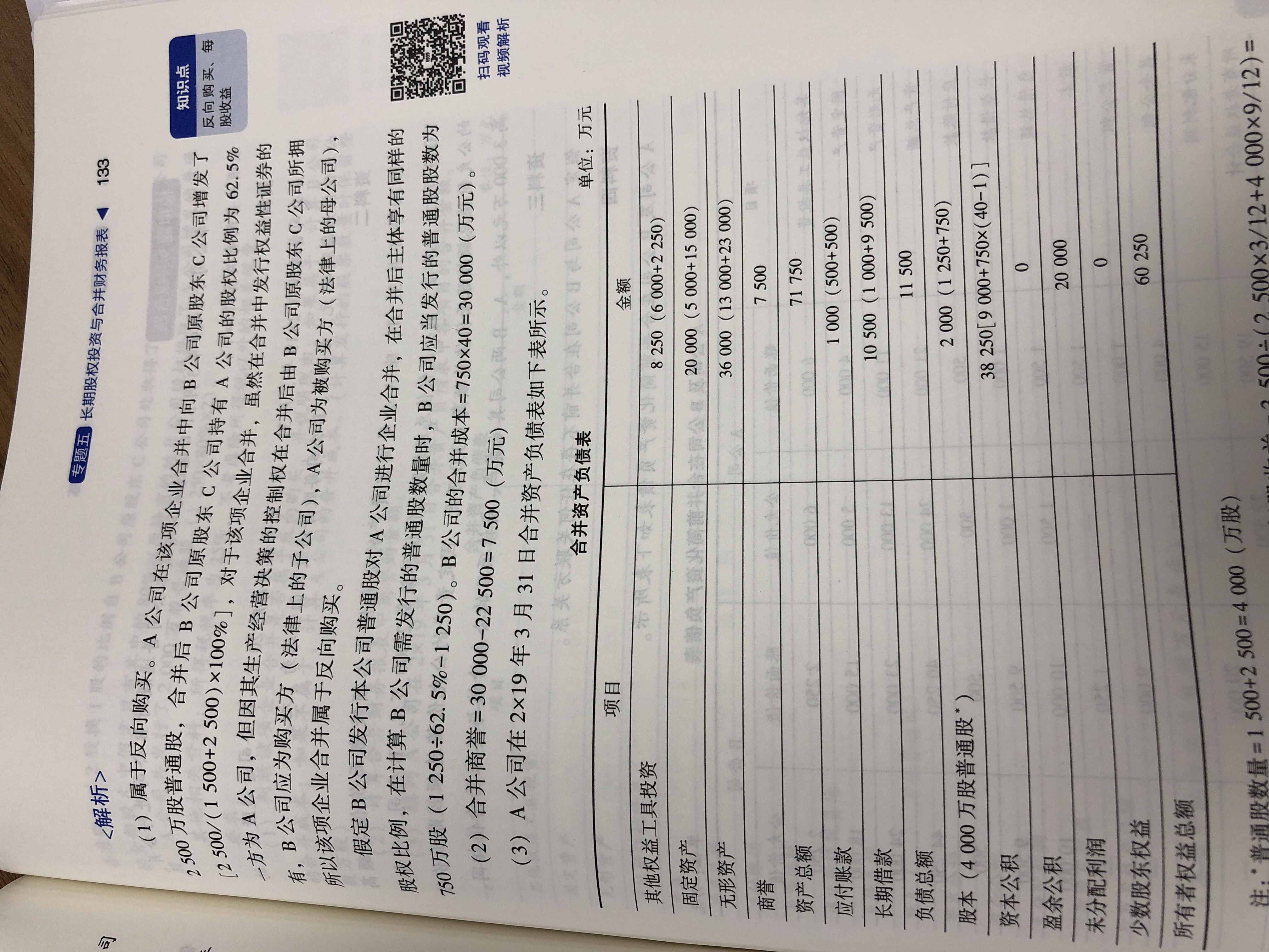 主观题高频考点,第131页,模拟题8,反向购买的合并商誉,A 是会计上的子公司,B是会计上的母公司,母公司持有子公司62.5%的股权,22500为什么不用乘62.5%
