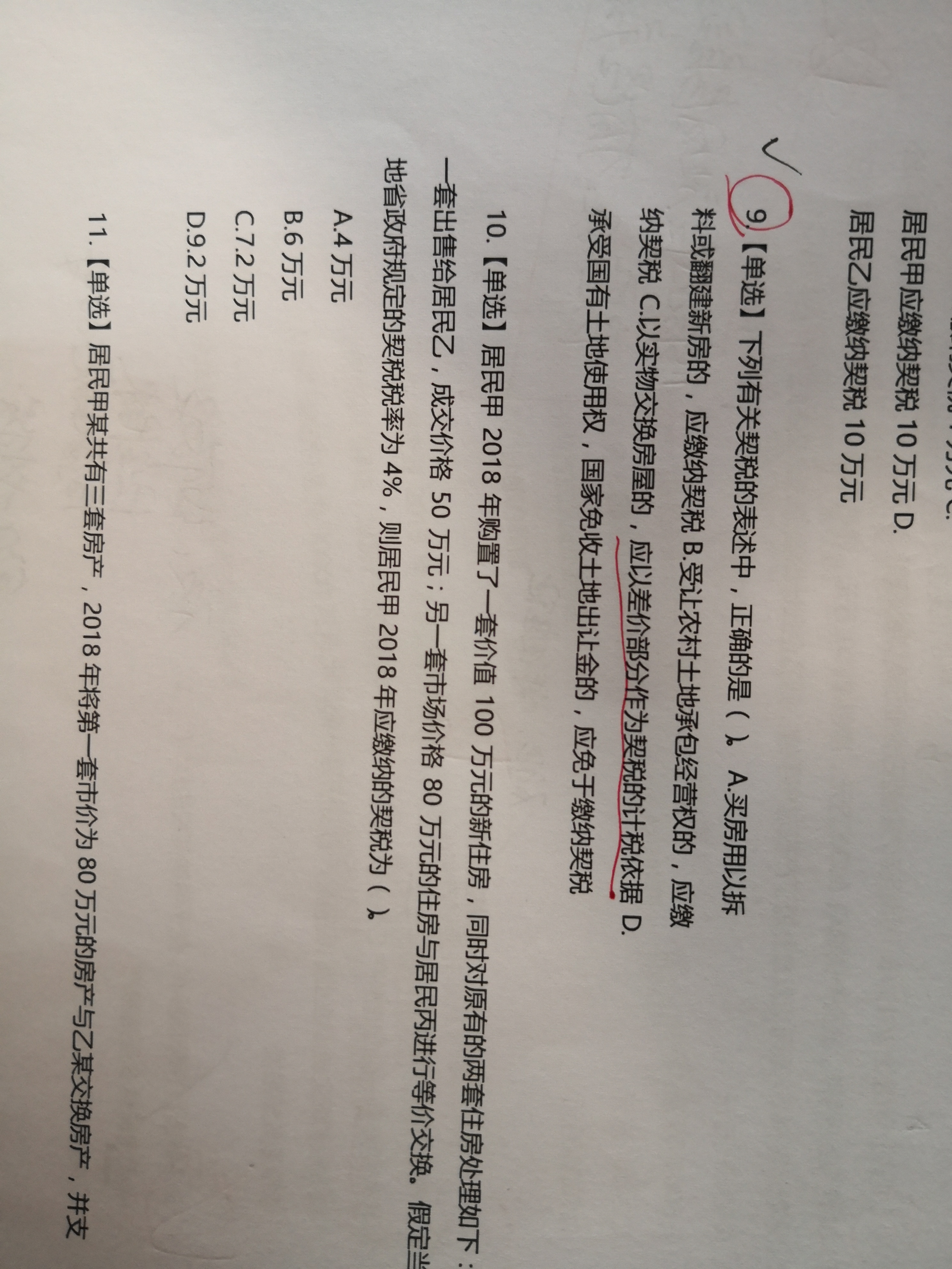 第9题 C 房屋交换 不就是针对差价进行征收的吗?房屋抵债,是房屋公允价为计税依据吗?