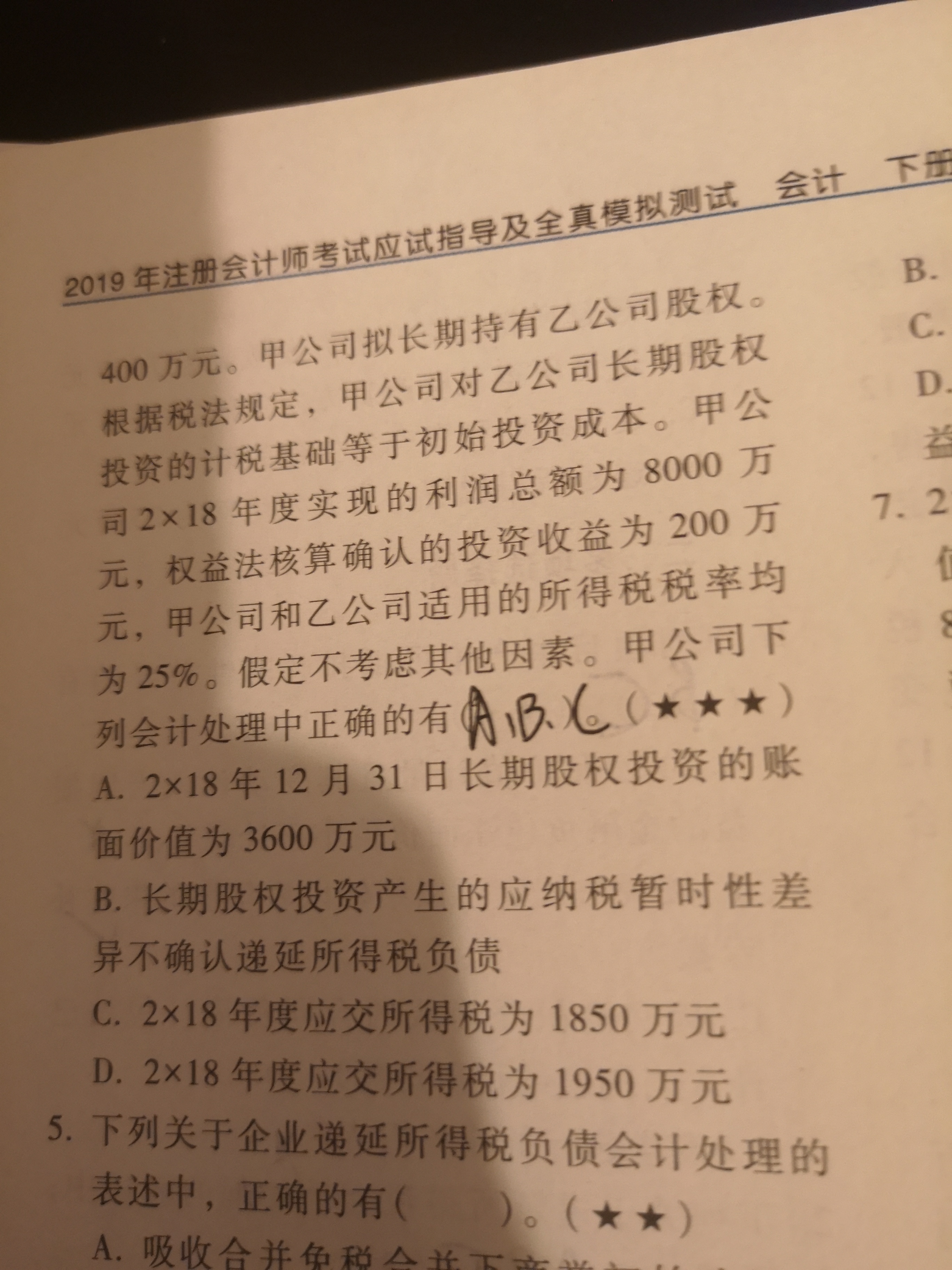 对于权益法的长投,我们股息红利是免税的,也就是被投资方分过来的200的投资收益会纳税调减,投资时点成本小于可辨认净资产的差额也暂时不用交税,所以确认的营业外收入也要纳税调减,因此是在利润8000的基础上纳税调减600.