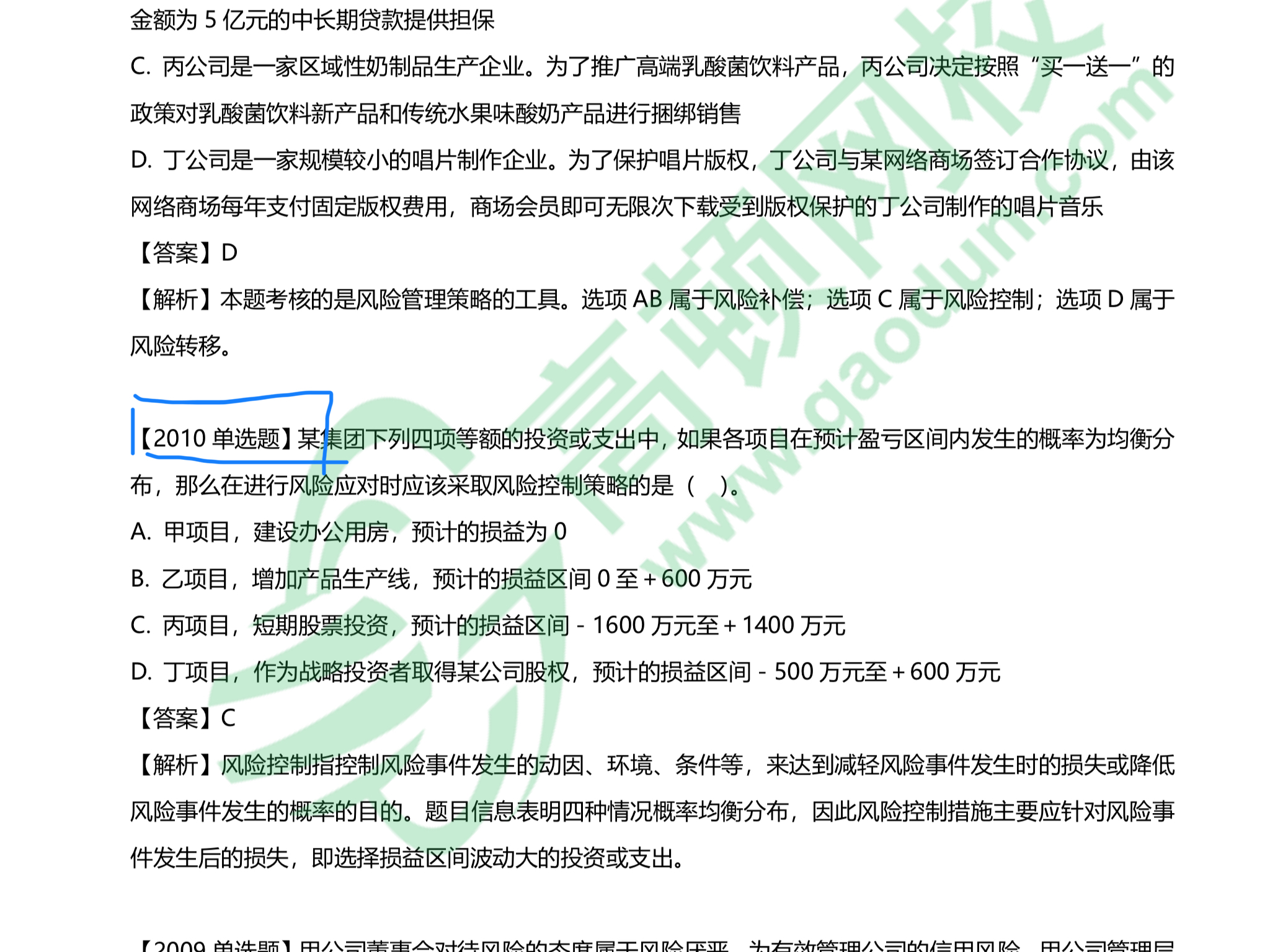 企业针对“风险最高的项目”采取风险控制的措施,在这四个选项中,C的风险波动最大,有可能发生的亏损也最大,所以最适宜采用风险控制。