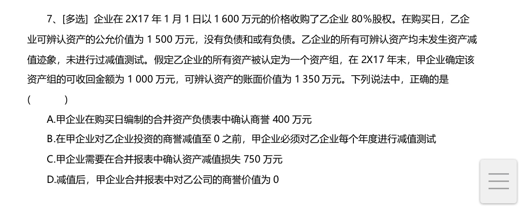 老师,商誉的减值分同一控制和非统一控制吗?这道题怎么解??...