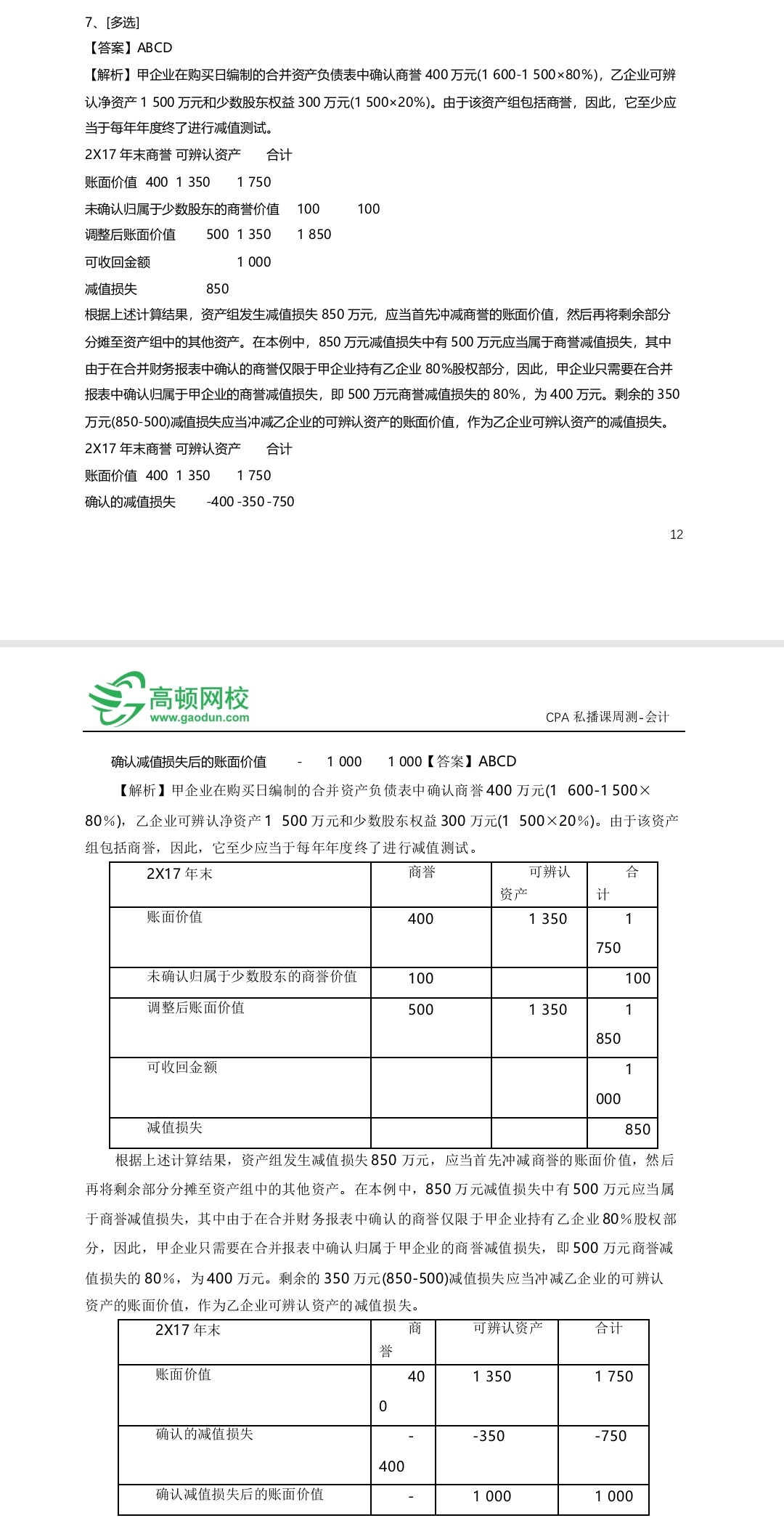 老师,选项C。我的想法:850的减值,先抵掉完全商誉500(其中80%,即-400属于甲公司),剩余350在可辨认的资产中抵减,甲公司也只需要承担80%(即-280),所以,合报中列式的应该是-680。C选项中,列式-750,岂不是只有商誉减值部分是按持股份额来承担的,但是资产承担的部分就全部归位甲公司了。 老师,帮忙解答一下~