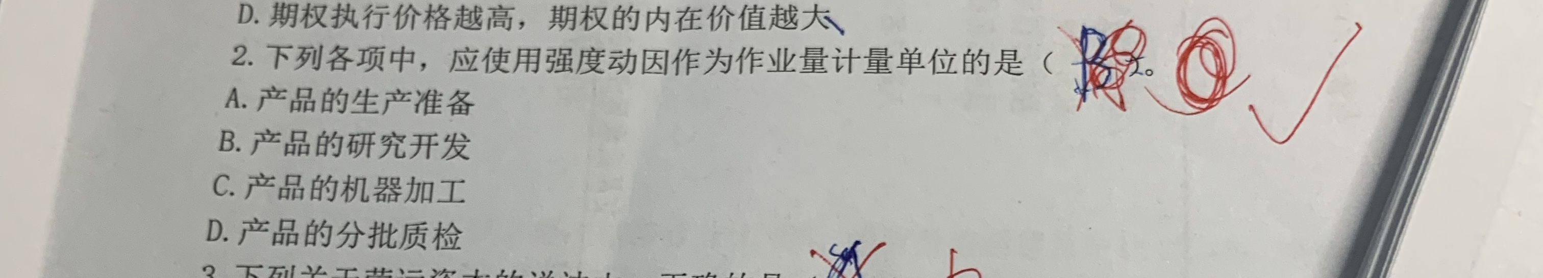 这道题是选B ,可以作为强度动因的是产品的研究与开发,因为这个是专门用于研究与开发某一特定产品的。