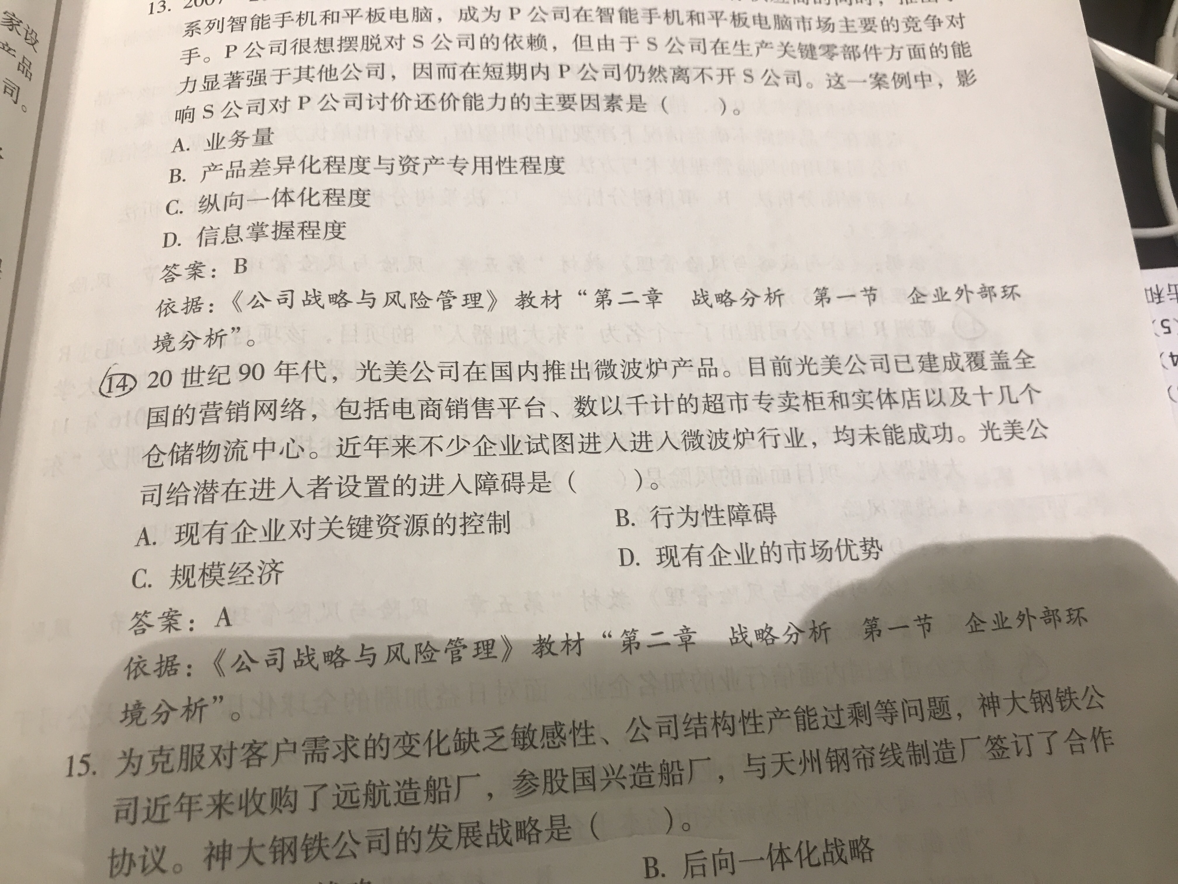 14题:控制了销售渠道是关键性资源,规模经济需要规模生产,题干中没有涉及到;现有企业的市场优势主要体现在品牌和政策上,本题中也没有涉及;