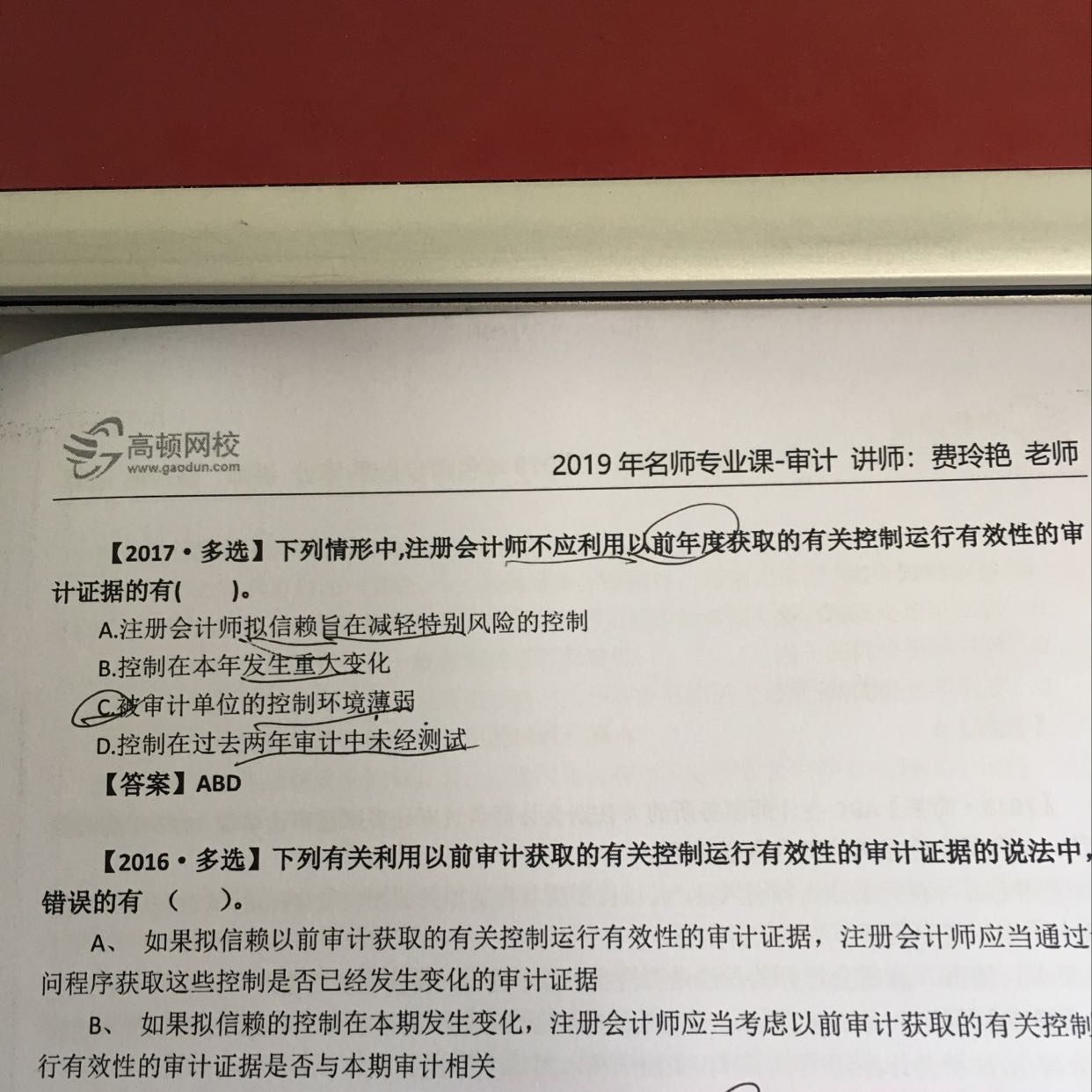 当被审计单位控制环境薄弱或对控制的监督薄弱时,注册会计师有两种选择:一是缩短再次测试控制的时间间隔(就是平常是3年测一次,现在缩短成2年测一次),二是完全不信赖以前审计获取的审计证据。