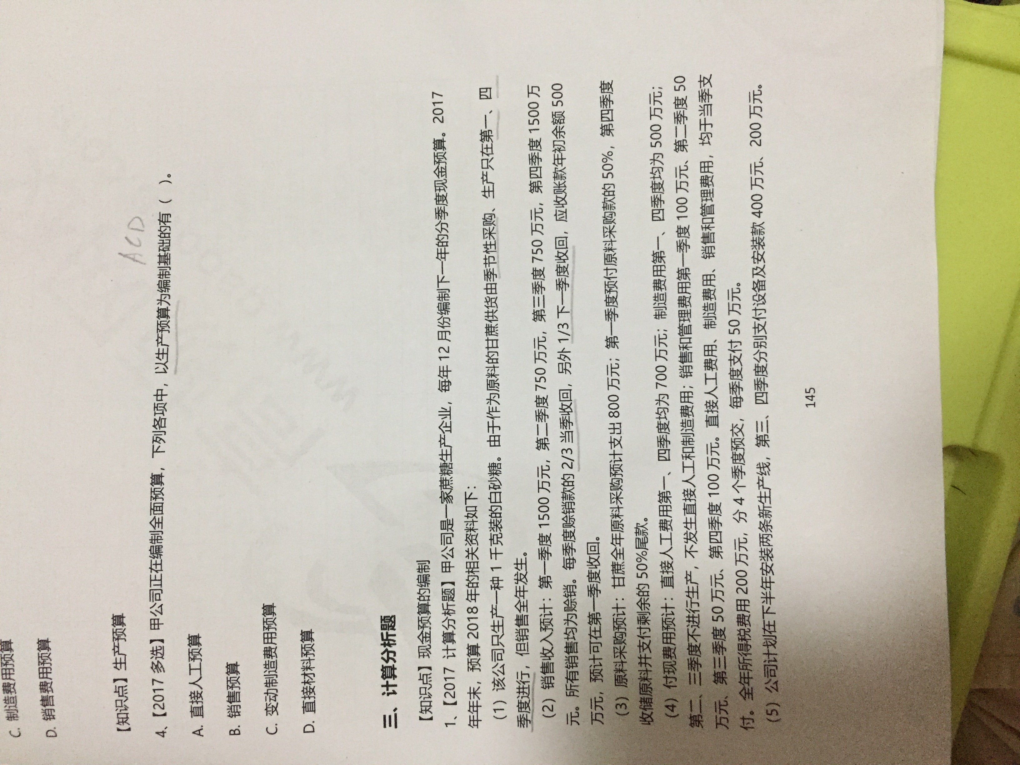 因为题中给出2017年年末公司从银行借入短期借款255万元,这里的条件其实是暗示每季度借款时,要将下季度需要偿还的借款利息考虑在内。因为如果借款250万元,那么2017年年末现金余额=12+250=262万元,是大于260万元,但是此时借款是255万元。因此试讲2018年第一季度支付的短期借款利息考虑在内的。同理2018年第四季度银行借款也应该将2019年第一季度支付的借款利息考虑在内。这道真题确实有点难度,当年有很多同学没有注意这里面的隐含信息而导致失分。跟往年考的有点不一样!要注意审题哈~~
