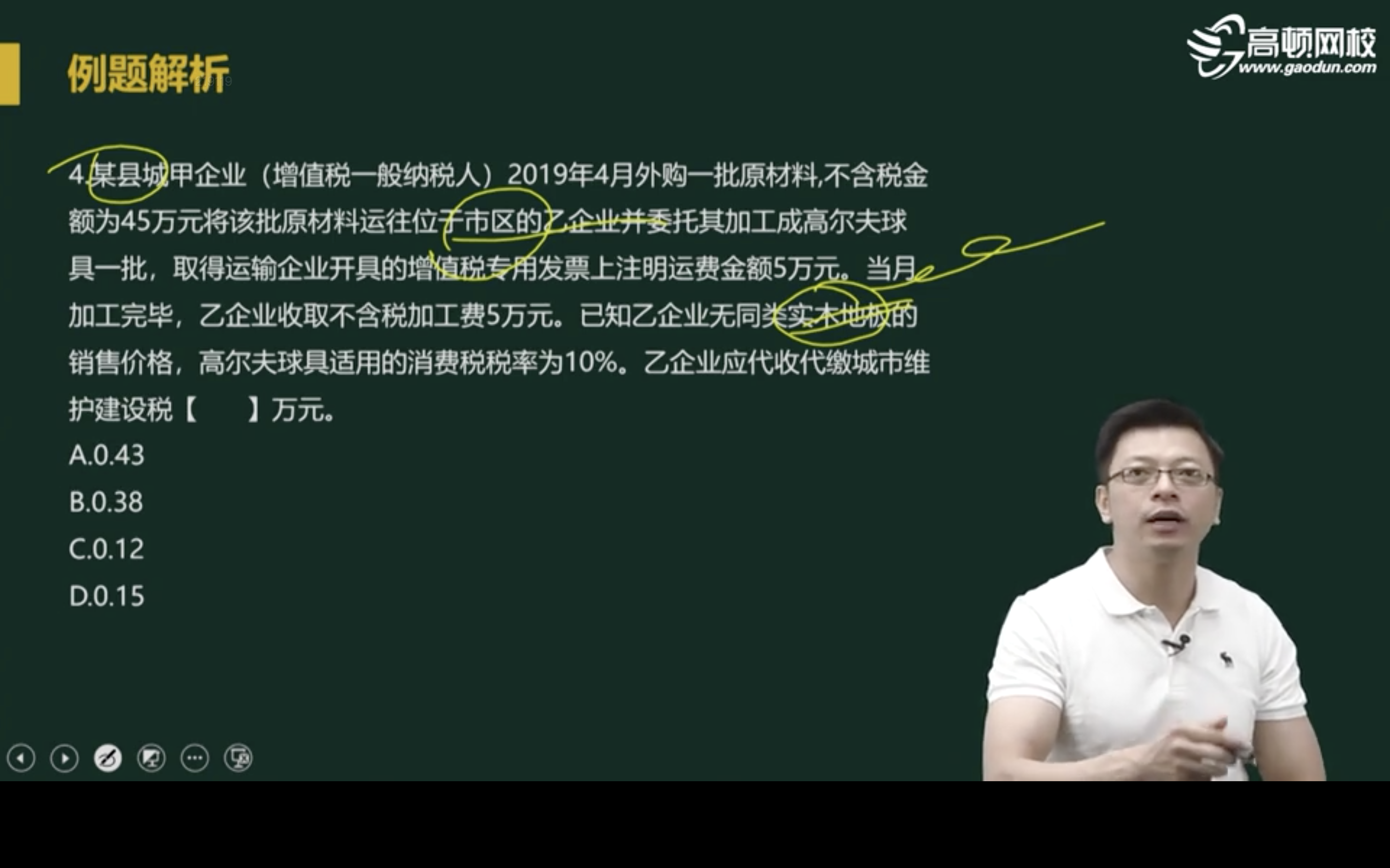 老师您好,这道题目我有几个疑问,1. 乙企业代替甲企业代扣代缴的增值税为什么不做为城建税的计税依据呢,2. 我对委托加工业务的增值税的缴纳问题不太明白,乙企业是受托方,只对自己的加工费5万元缴纳增值税,那甲企业呢,收回产品卖掉以后再缴纳增值税吗,即从乙企业收回时,没卖,那就不缴纳增值税是吗,3. 如果题目问的是乙企业自己缴纳的城建税,那就是加工费5*0.13*0.07,对吗 4. 如果消费税的话,那么乙企业是受托方,代替甲企业缴纳消费税,是扣缴义务人,但是实际的纳税义务人是甲企业对吗,4. 如果甲企业收回,以不高于乙企业的价格卖出,那么不用再缴纳消费税,如果高于价格卖,那么按照差价再缴纳一笔消费税对么,问题有点多,谢谢老师解答