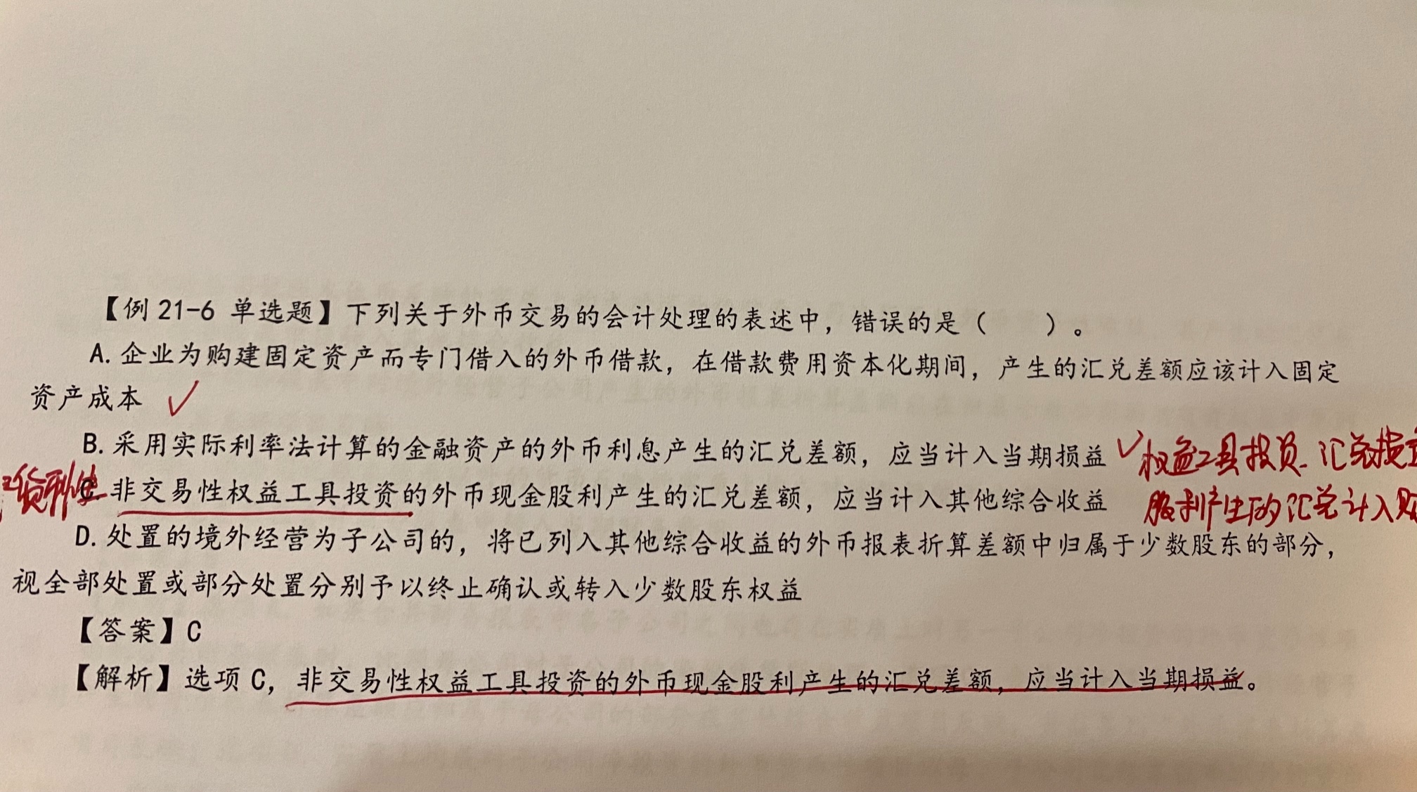 老师,这题的C选项,非交易性权益工具投资指的是其他权益工具投资对吧?其他权益工具投资的汇兑损益和公允价值变动,都计入OCI, 但是应付股利如同货币性,所以汇兑损益计入财务费用,能这样理解吗?