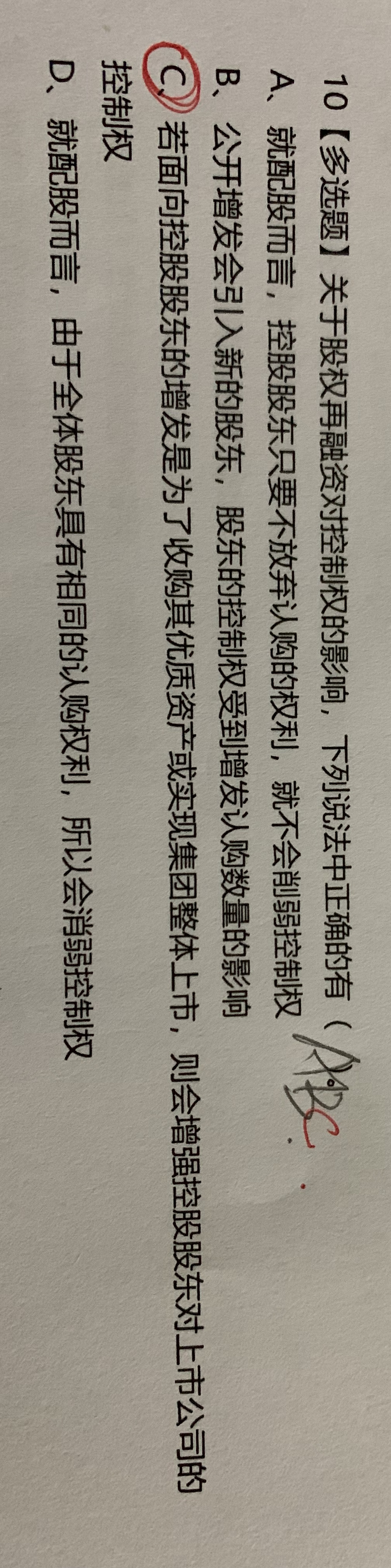 选项C说的是面向控股股东增发股票获得公司的优质资产或者实现集团整体上市,也就是说控股股东在增发后持有更多的股票,使得其持股比例增加,从而对公司的控制权增强了。