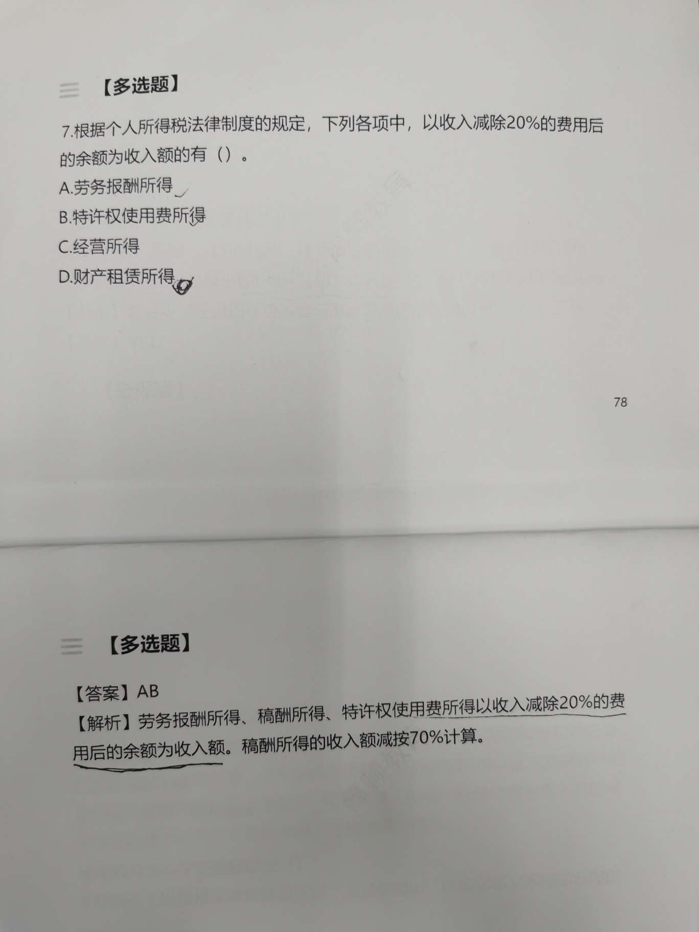 这道题为什么选AB不选D呀,讲义上租赁是扣0.2呀,而且劳务报酬和特许权使用费还是超4000才扣0.2,不超不扣呀