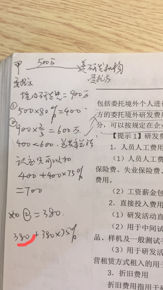 老师的意思是不知道这个380是怎么算出来的,老师把计算依据给同学:委托境外研发,按照费用实际发生额的80%计入委托方境外研发费用,不超过境内符合条件的研发费用的2/3的部分,可以按照规定在企业所得税前加计扣除~