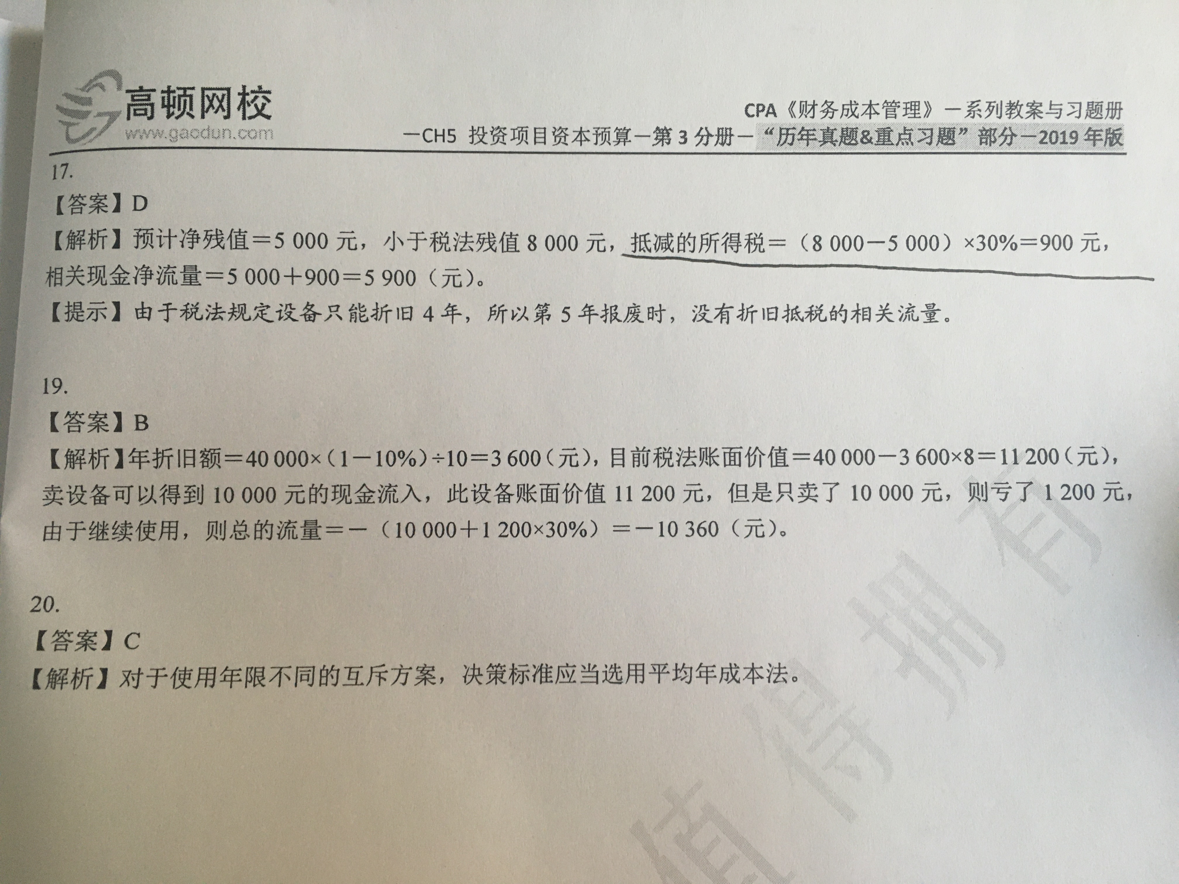 17题,算残值变现金额了啊, 5000就是残值变现金额,相当于是账面价值8000,卖了5000,亏了3000可以抵税900,现金净流量=5000+900.