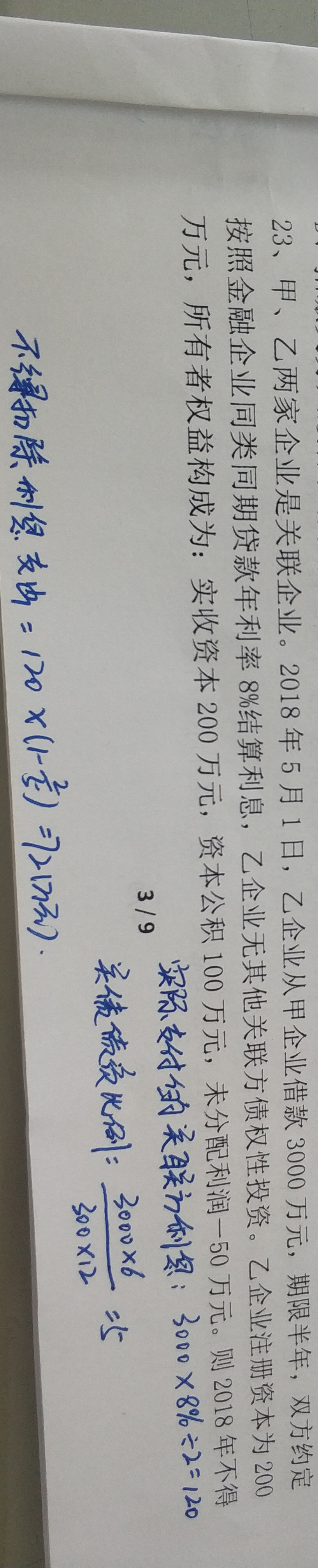 先算关联债资比=(3000*6)/(300*12)=5,然后不得扣除的利息=3000*8%*6/12*(1-2/5)=72