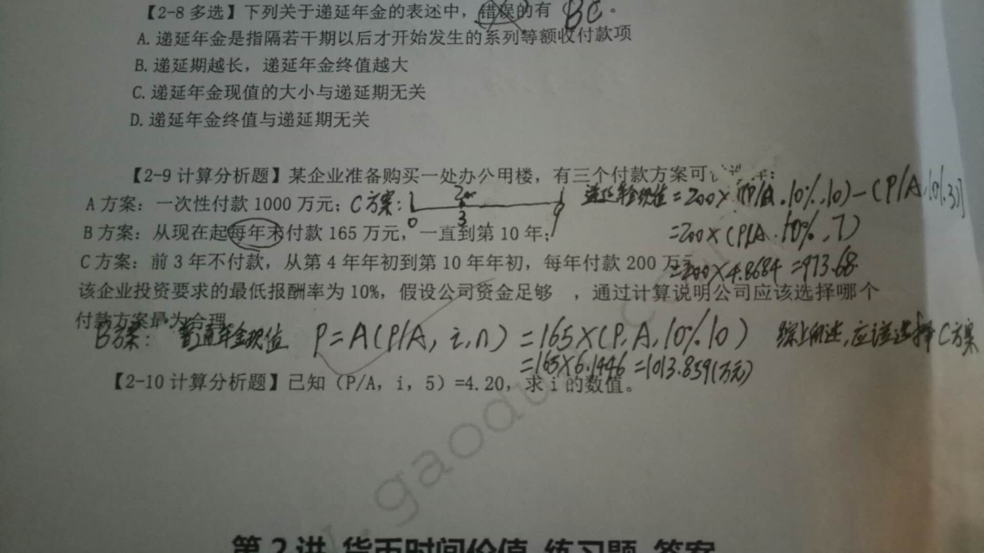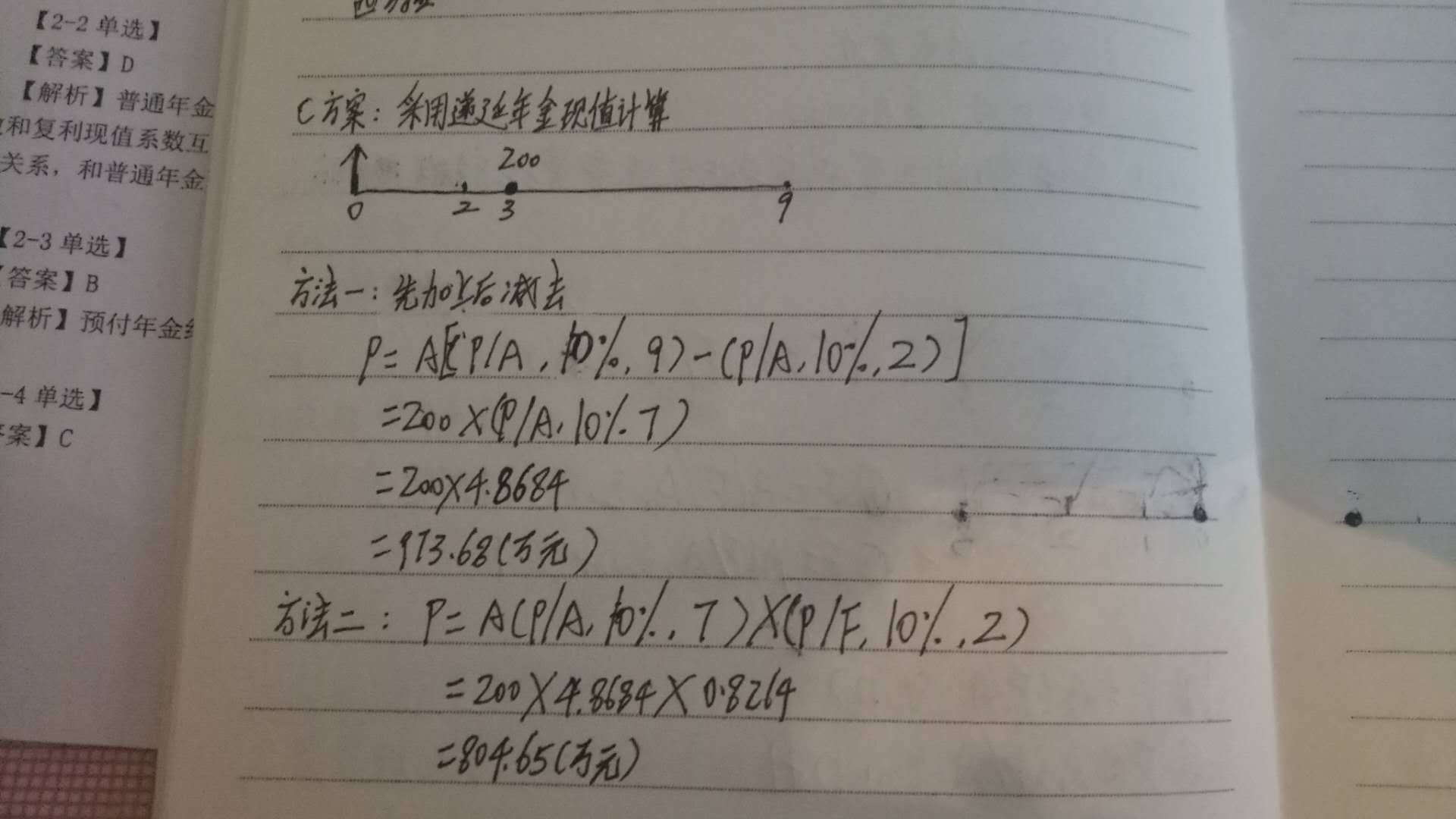 老师帮你验算出来了,你最开始的公式是可以的,=200*【(P/A,10%,9)—(P/A,10%,2)】=200(5.7590-1.7355)=804.7~