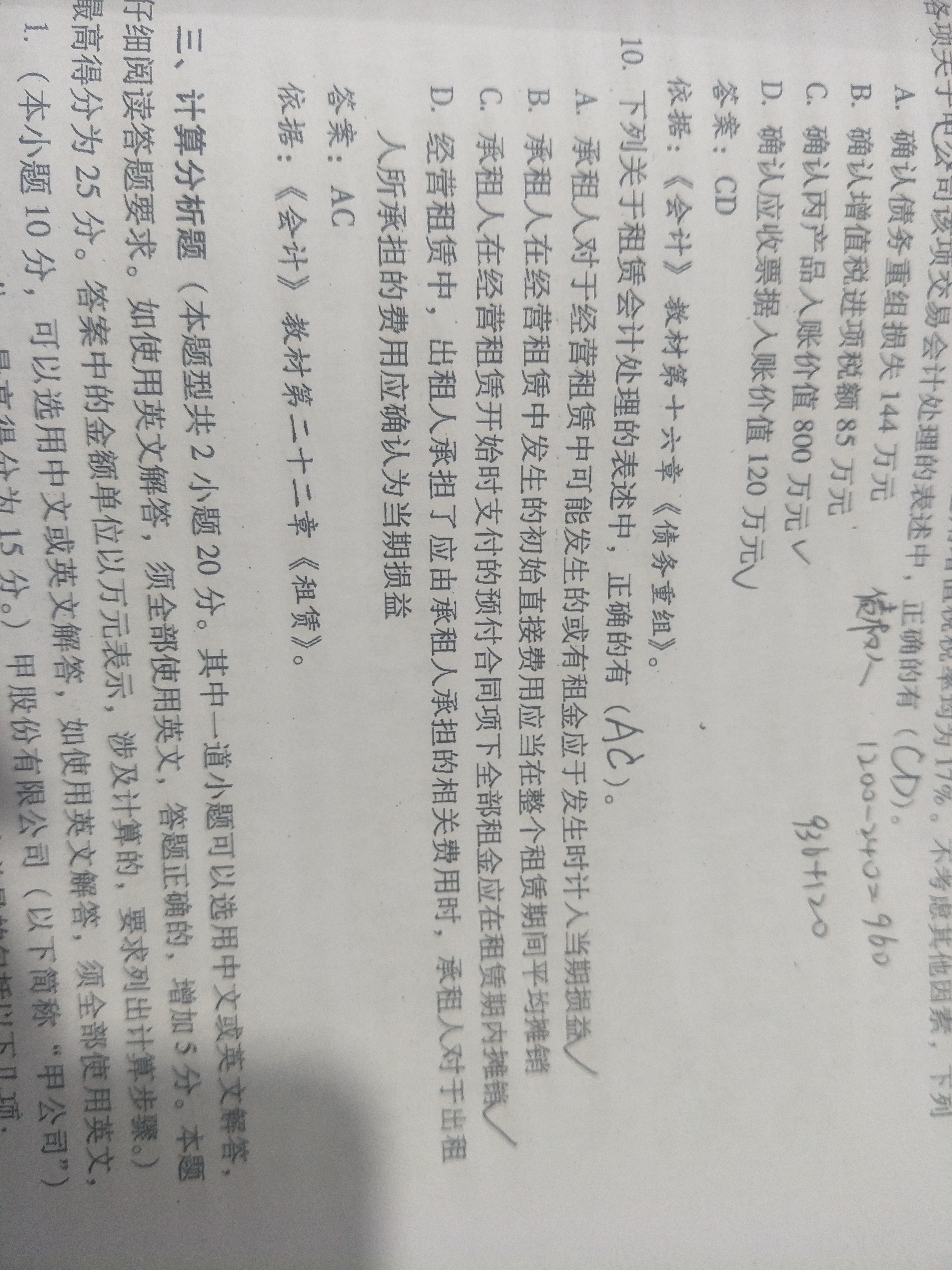 10,B 这个经营租赁的 初始直接费用可能一次性费用化的,所以B 不选;D 出租人承担了承租人某些费用的,承租人应将该费用从租金费用总额中扣除,按扣除后的租金费用余额在租赁期内进行分摊。所以不选D