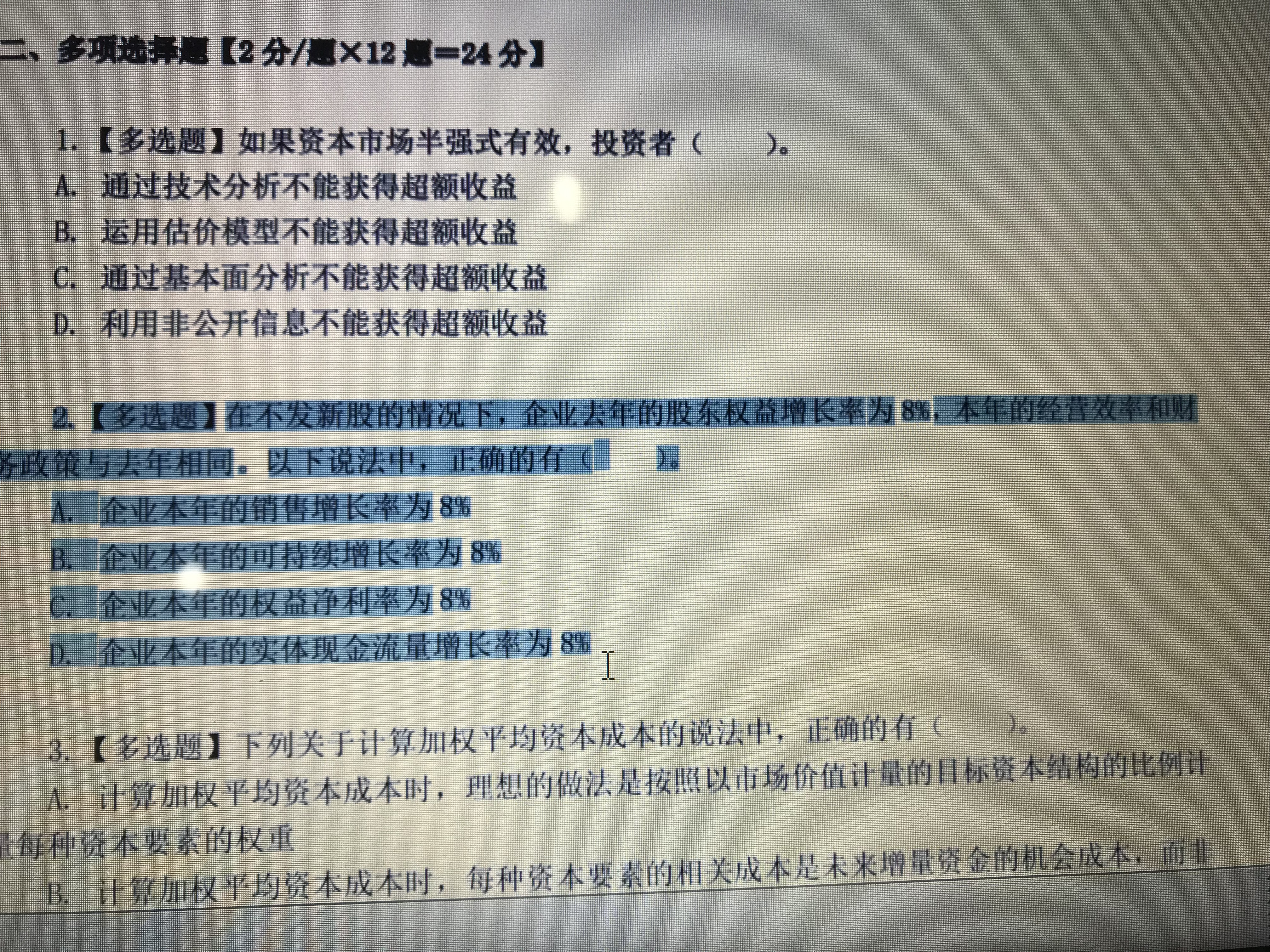 选项C,权益净利率=净利润/股东权益,在可持续增长状态下,我们只能得出净利润增长率、股东权益的增长率都等于可持续增长率,即分子分母都同比例增长,比值不变,但是得不出比值就是8%的结论,所以选择C错误