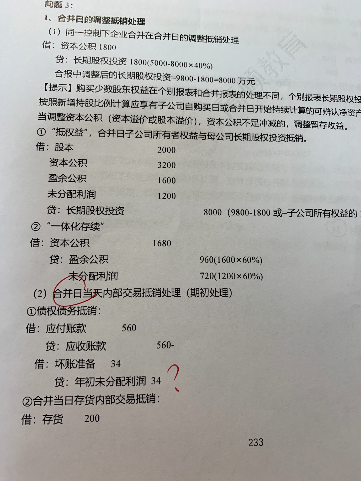 问题1: 为什么第一年的分录是借坏账贷年初未分配?是因为这是同控所以都是合并日后的处理吗? 问题2: 借存货200 贷年初未分配利润这笔分录是怎么写出来的?为什么教材上完全找不到呢,这不应该是内部交易存货那里的吗? 问题3:34咋算的