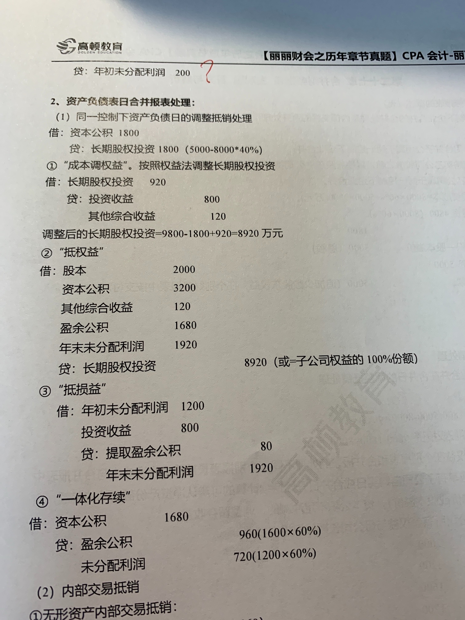 同一控制下企业合并第二年的未分配利润等都可以直接按照题目用,...