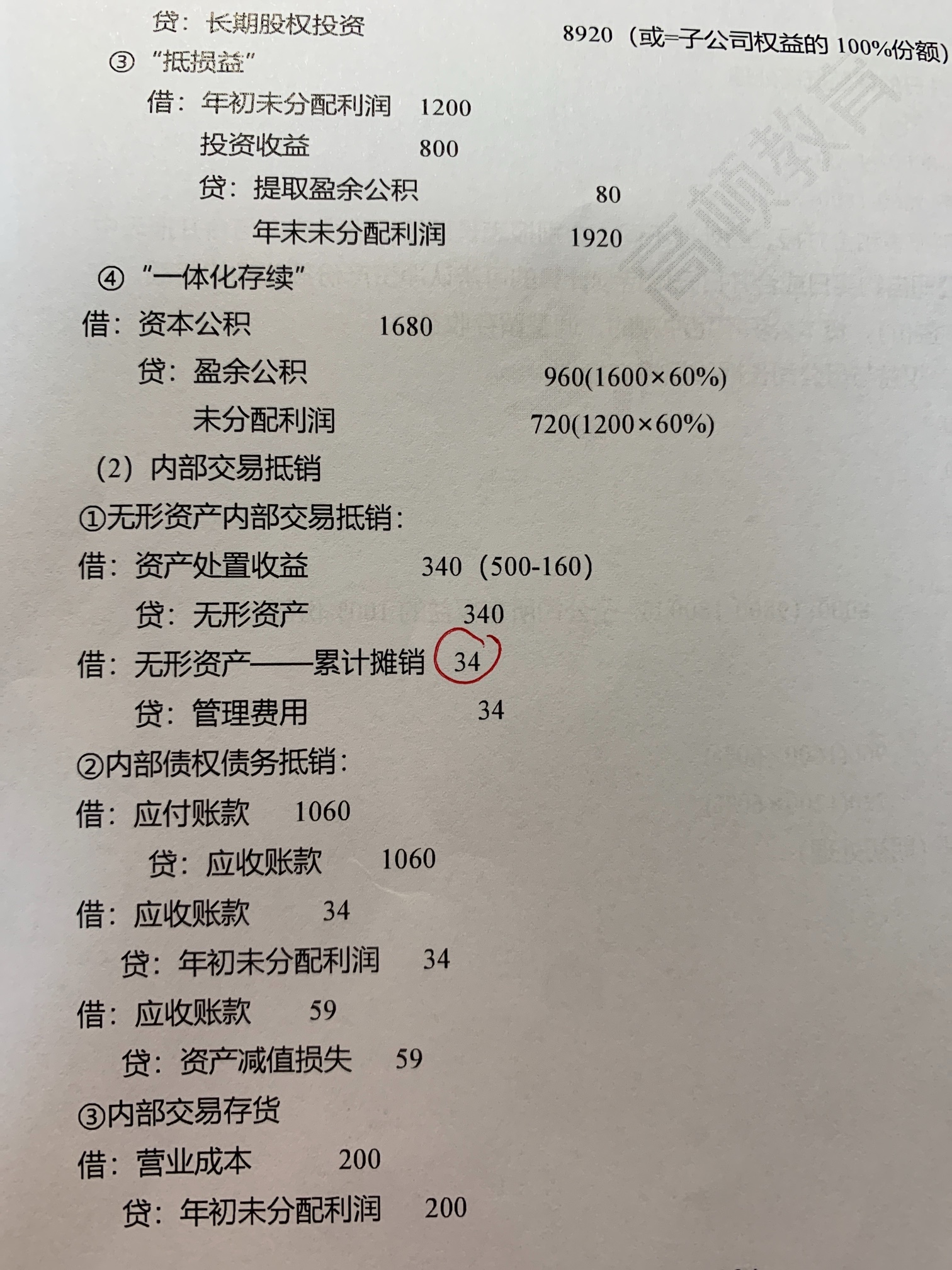 1.该笔内部交易在合并日7月1日前已经发生,同控下企业合并可以理解为连续编报的情形;2.资料(2)乙公司的存货中有300万元是自甲公司购入拟出售的,但尚未出售,甲公司出售时账面价值500万元;3.(500-160)/5*6/12=34。