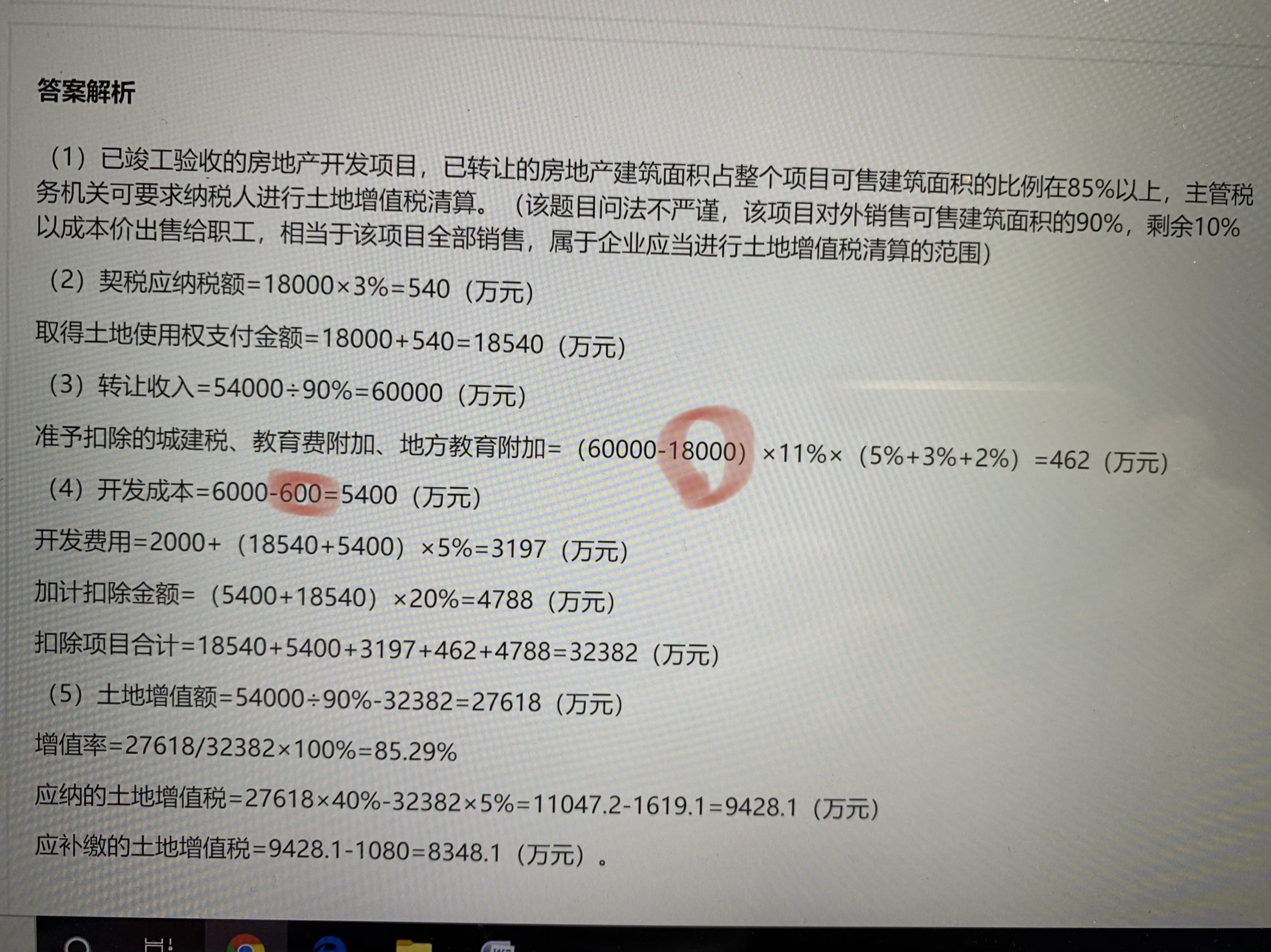 老师,我有两个问题,请看红圈部分。为何扣除18000土地价后算增值税,而且是11%? 为何题目的600是单独列明的,却还要在成本里扣除? 谢谢老师