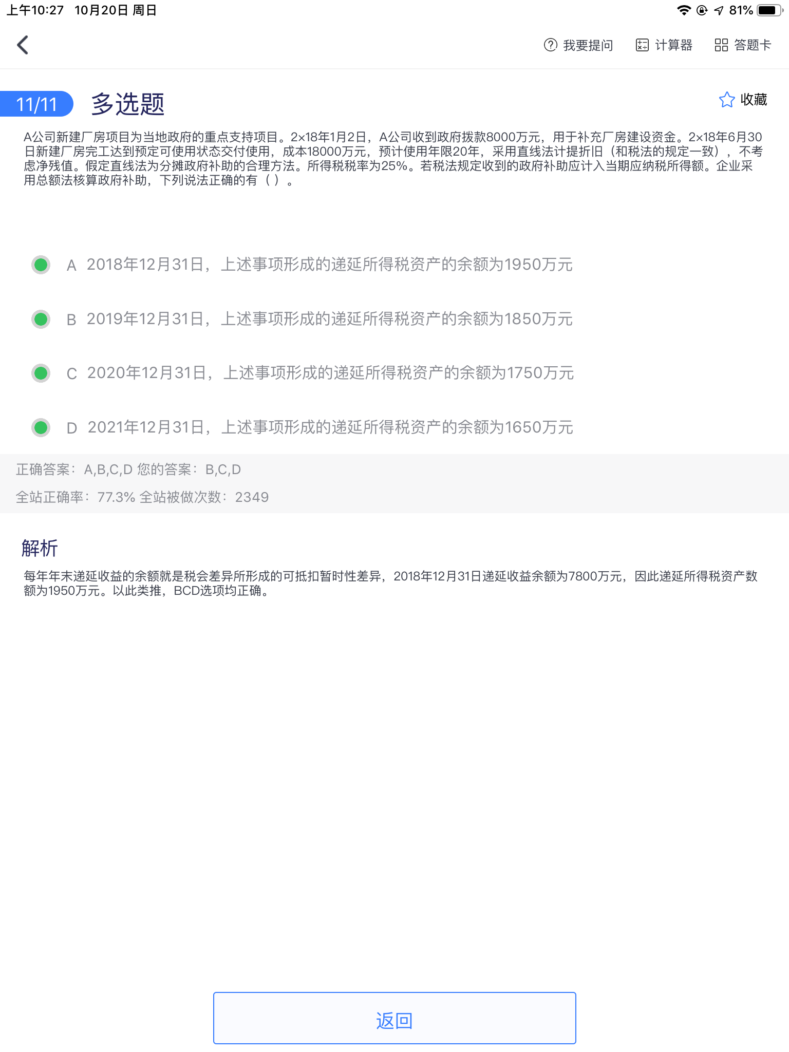 18 递延收益还剩7800-8000/20=7400,递延所得税负债的余额是7400*25%=1850