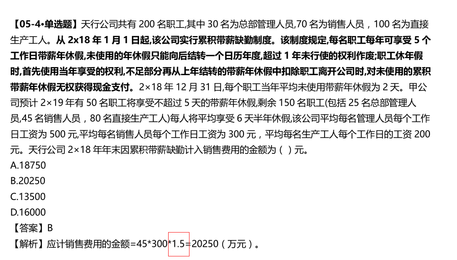 2018年末确认累积带薪缺勤的销售费用,是预计2019年有45名销售人员,每个工作日300元,享受6天半的休假,6天半-5天=1.5