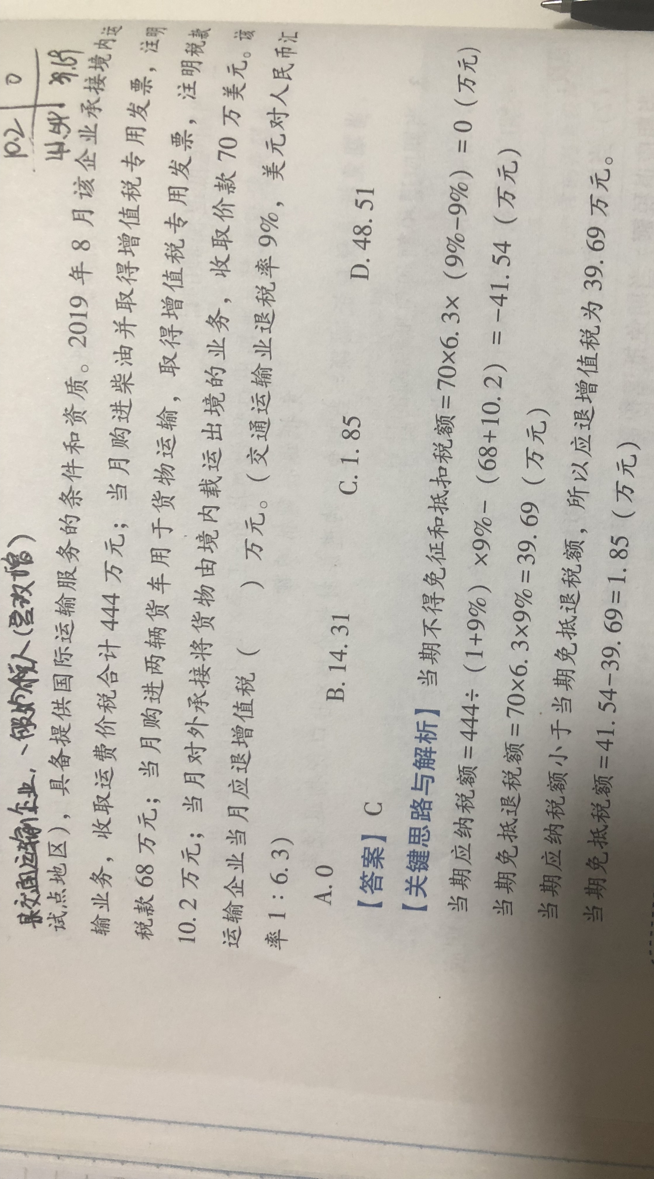 老师您好,我想问这个题目为什么 应退的增值税不是39.69丫。1.85不是留底税额嘛?不明白这个题目,麻烦老师讲解一下,谢谢老师!