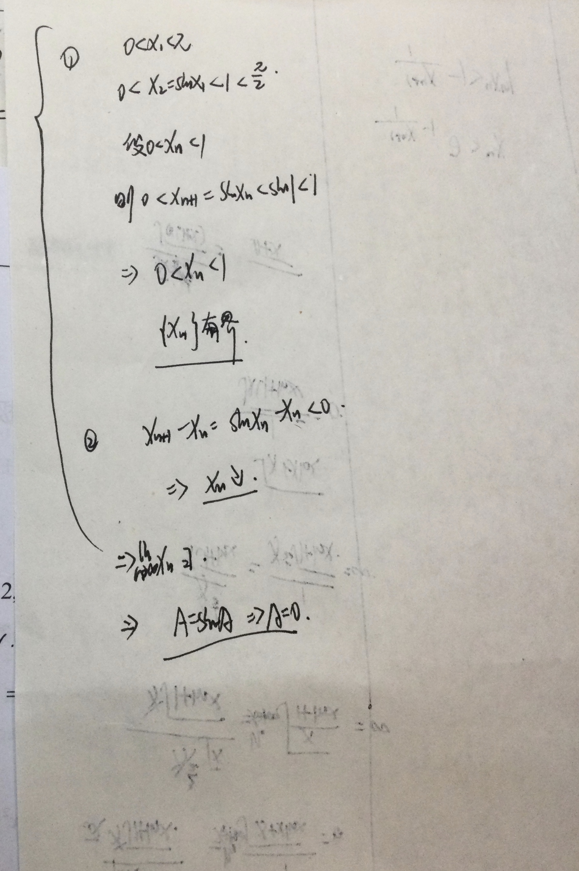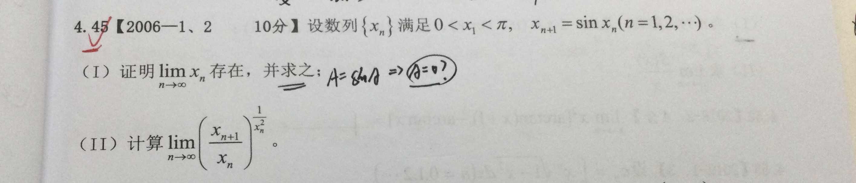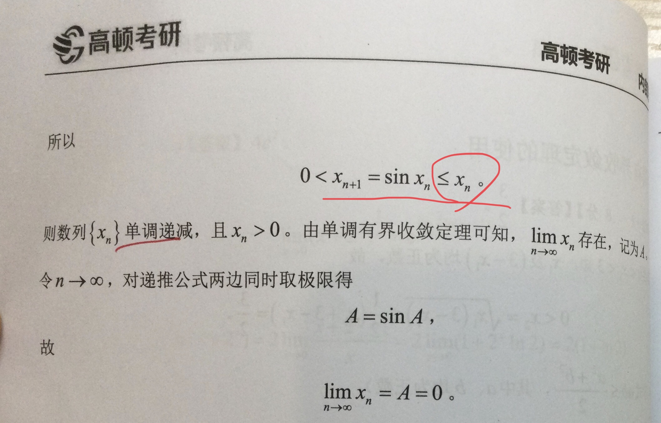 老师你好 我想问下 这道题我有两个问题 1.我图四这样写对不对呀 因为我觉得答案稍微有那么一点问题??图三那个地方如果取等了 不就是单调不减了吗 单调有界不是只能单增或单减?或者说是我理解有偏差 2.然后我当时做题的时候还有一个问题就是 如果xn是大于0的 那极限可以为0吗 但是好像是不是xn取不到0并不影响极限为0?