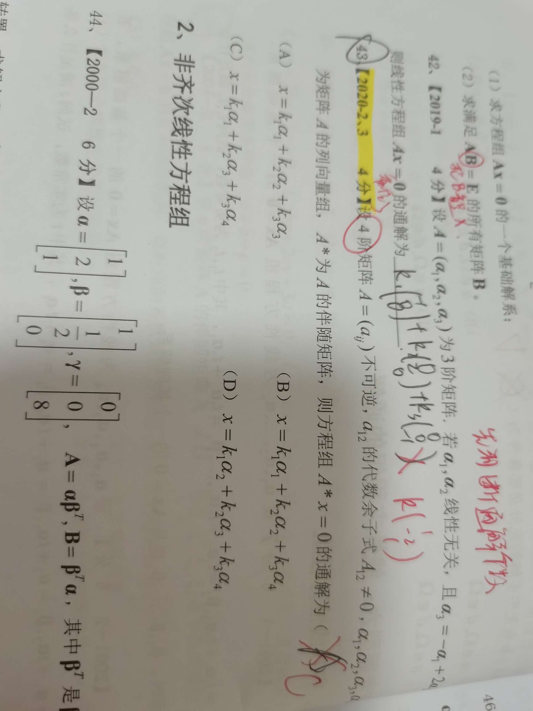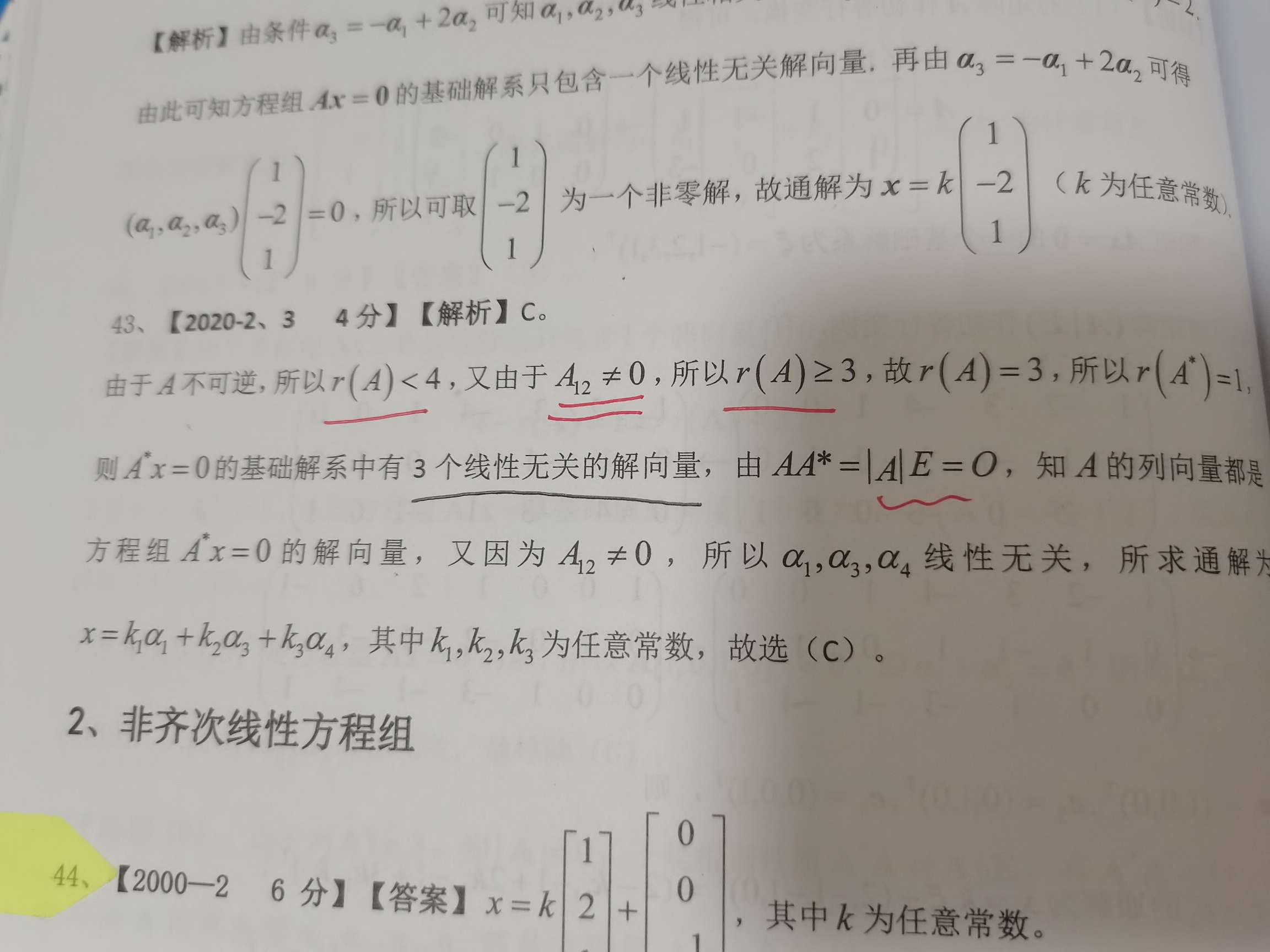 1、老师,为什么由a12不等于零?可以推出它的秩大于等于三,以及阿尔法一,阿尔法三,阿尔法4线性无关 2、行列式a×E,等于零,为什么a的列向量都是解向量?