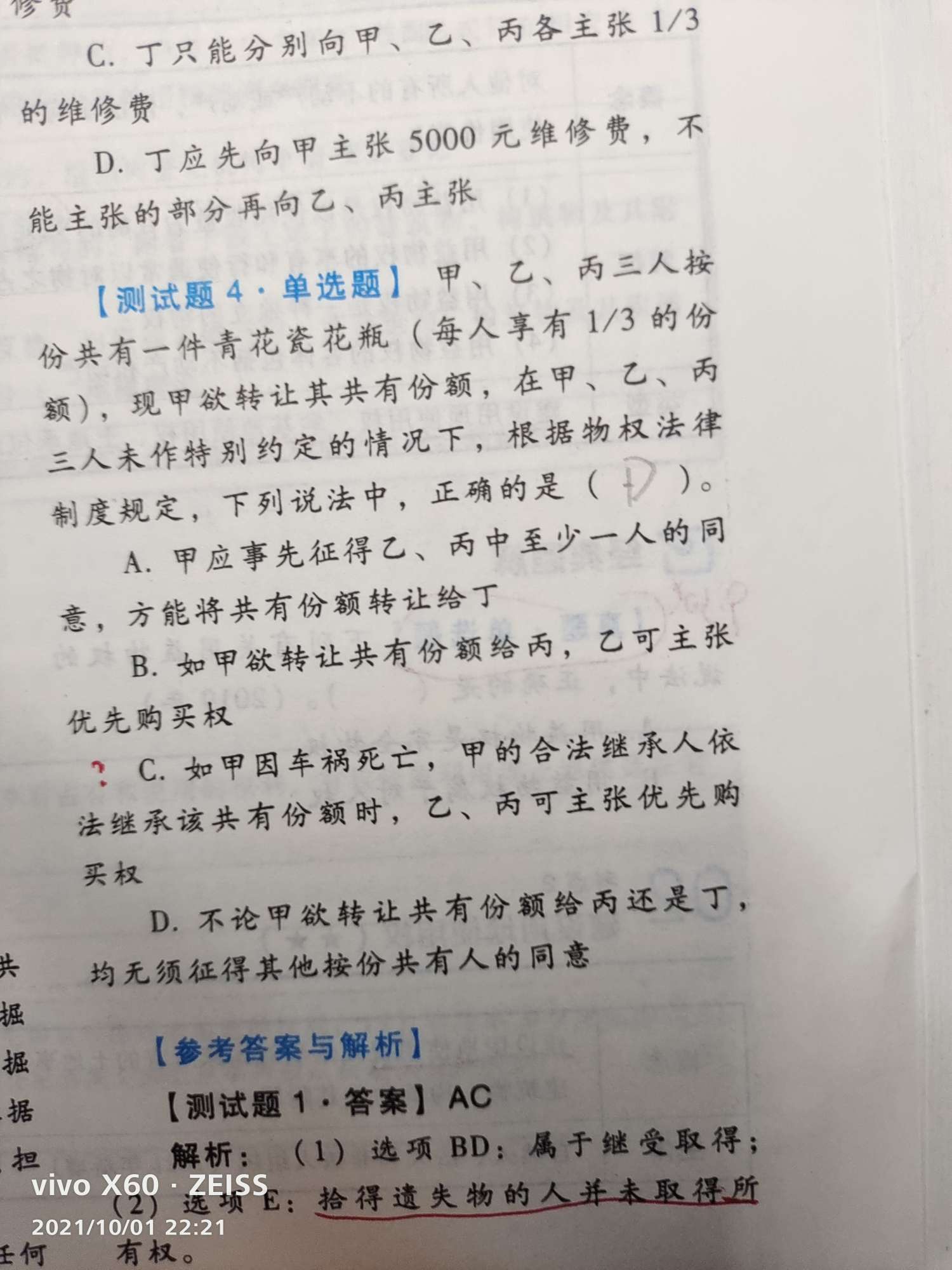 这题的c为什么不对呀?乙和丙不是拥有优先购买权吗?