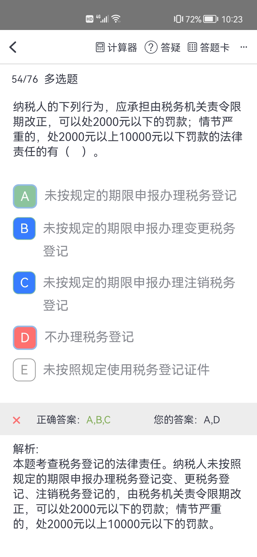 B、C选项不正确,教材没有提到变更税务登记和注销税务登记罚款。