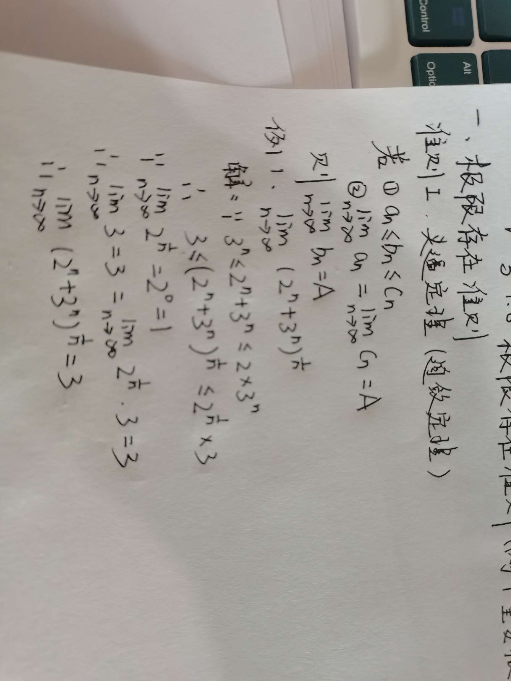 夹逼定理中这个前后放大和缩小是怎么回事 为什么第一张图那个还要乘一个n 而第二张图那个是小于2* 3的n次方大于三的n次方