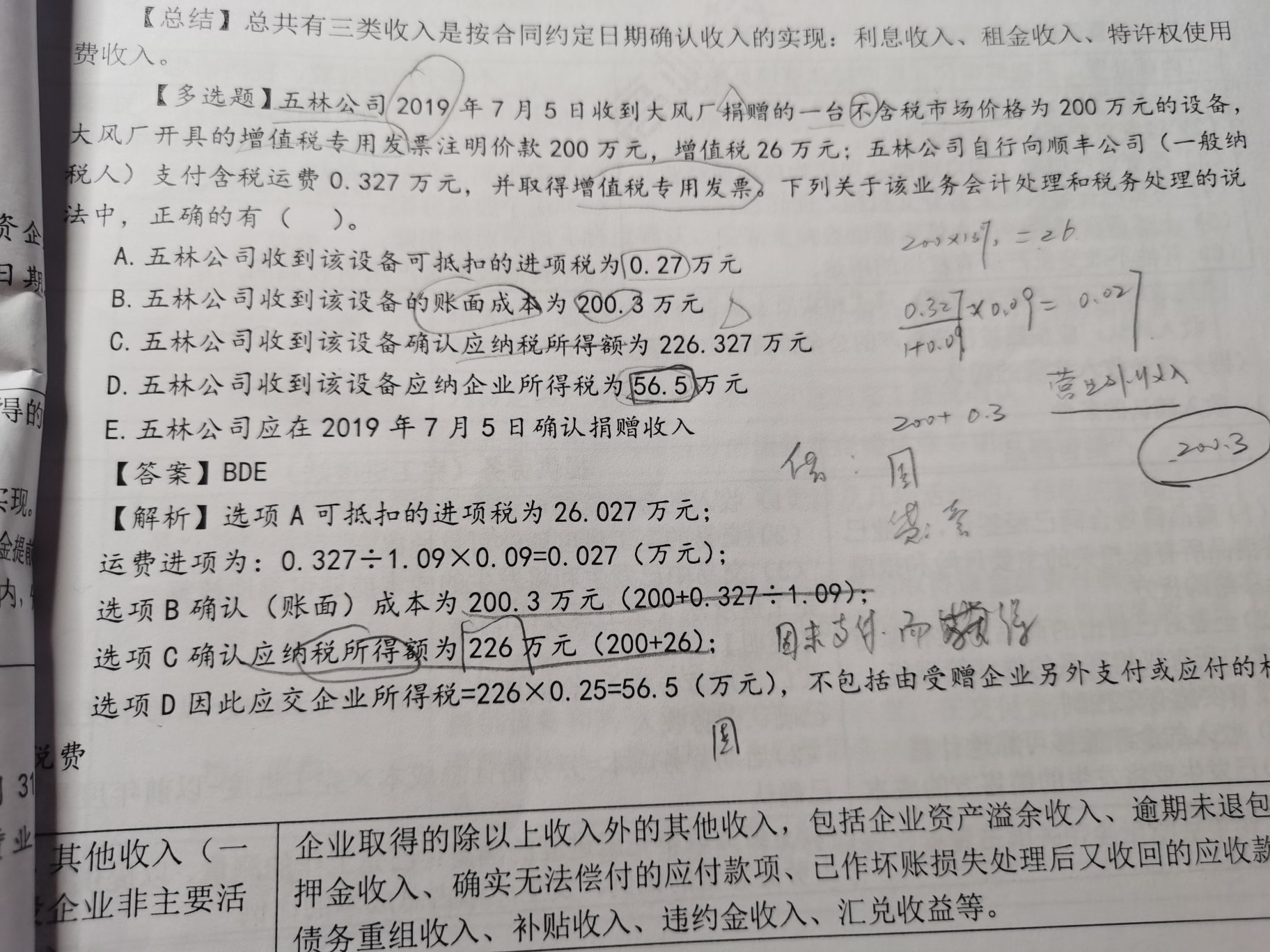 贷:营业外收入 226 接受捐赠确认所得226,因为是利得,所以是含增值税的。