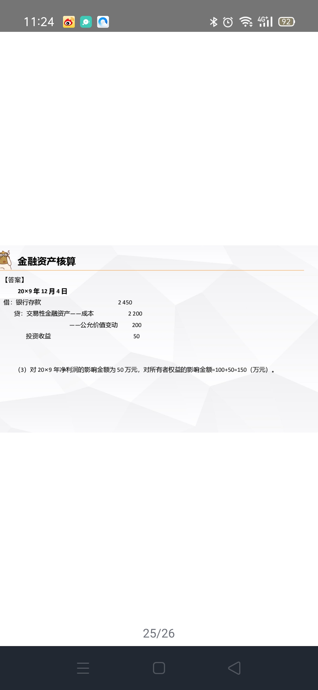处置交易性金融资产,公允价与账面价的差额50计入投资收益,题目问的是对 20×9 年 12 月31 日所有者权益的影响,期末投资收益会转入本年利润,最终结转到未分配利润,是会影响所有者权益的,因此,对所有者权益的影响金额=100+50=150