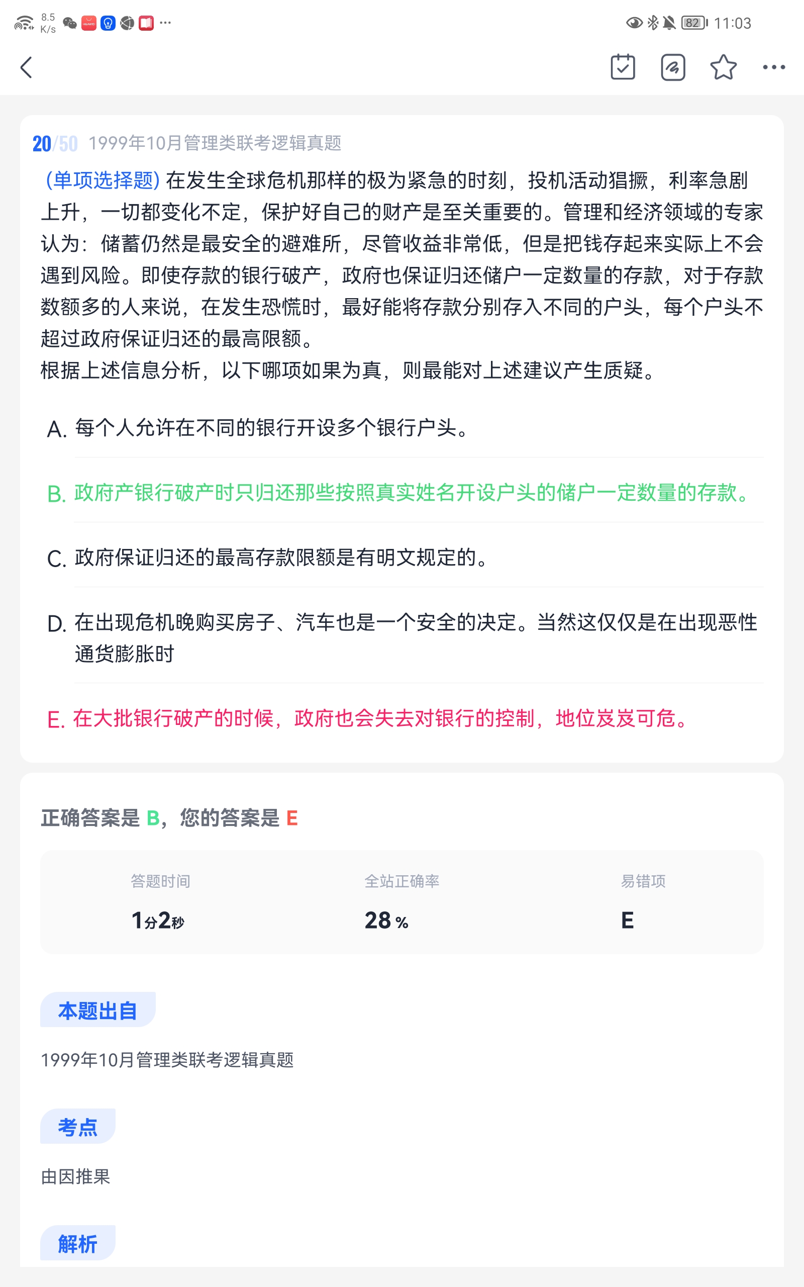 琳同学这题应该选E,B选项以同一真实姓名也可以将存款存入不同户头,B选项无法质疑