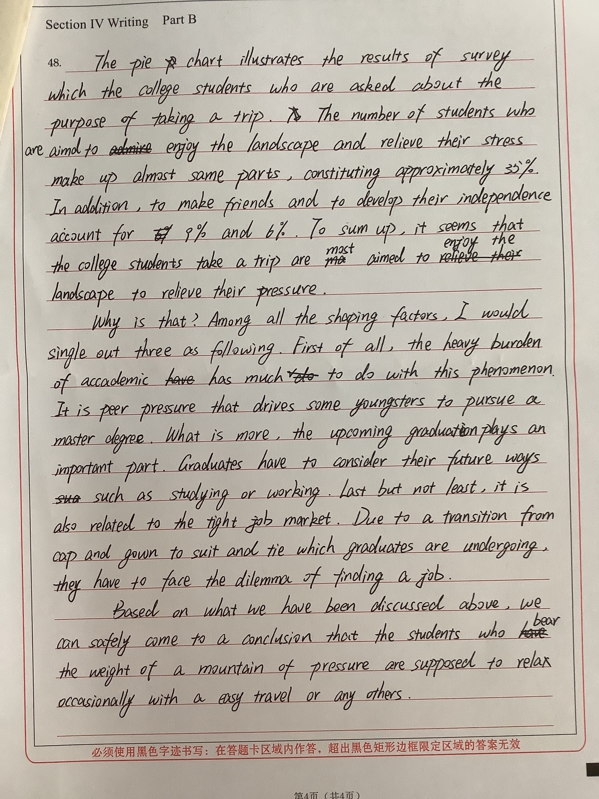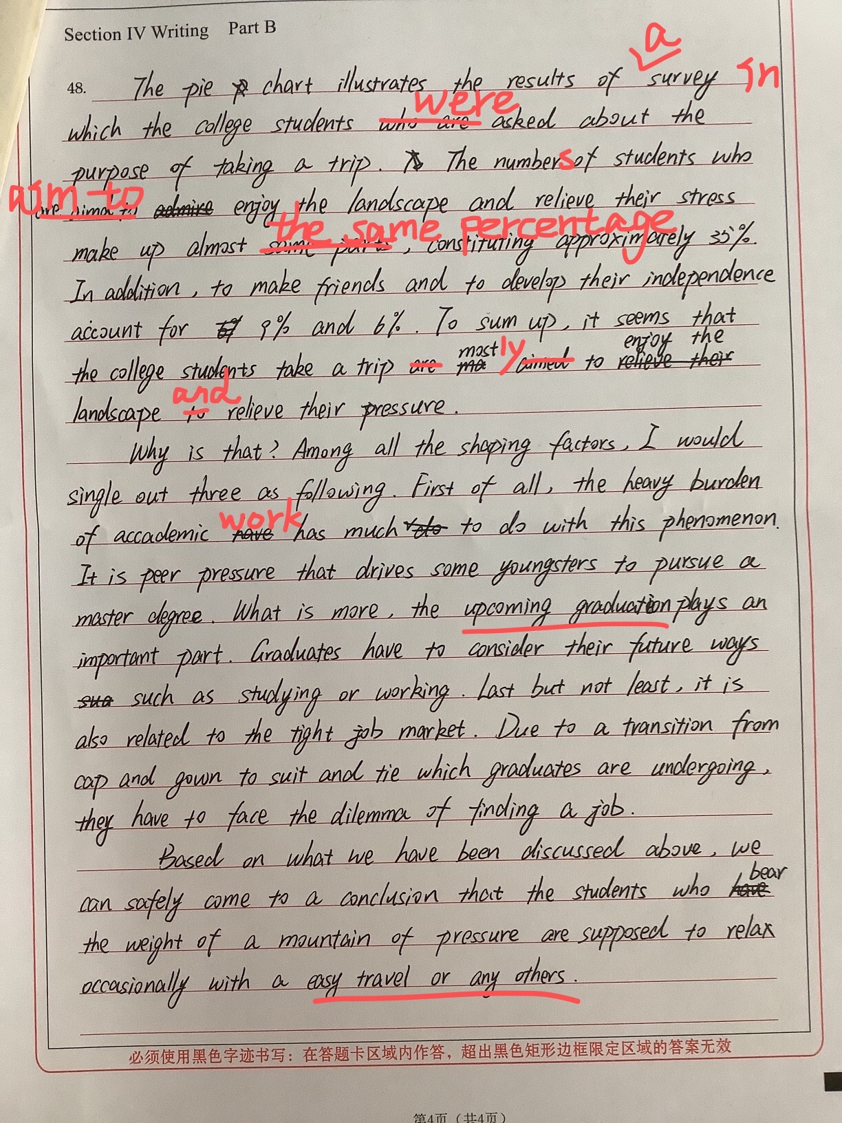 第二段呢,写得很顺,但是就业压力和这篇作文的主题不太对应啊,题目是调查旅游目的,缓解压力也只是其中一个成分,占比还不是最大的。你论点中的考研,马上到来的毕业也和这个2017年的调查结果不太能对得上呢!