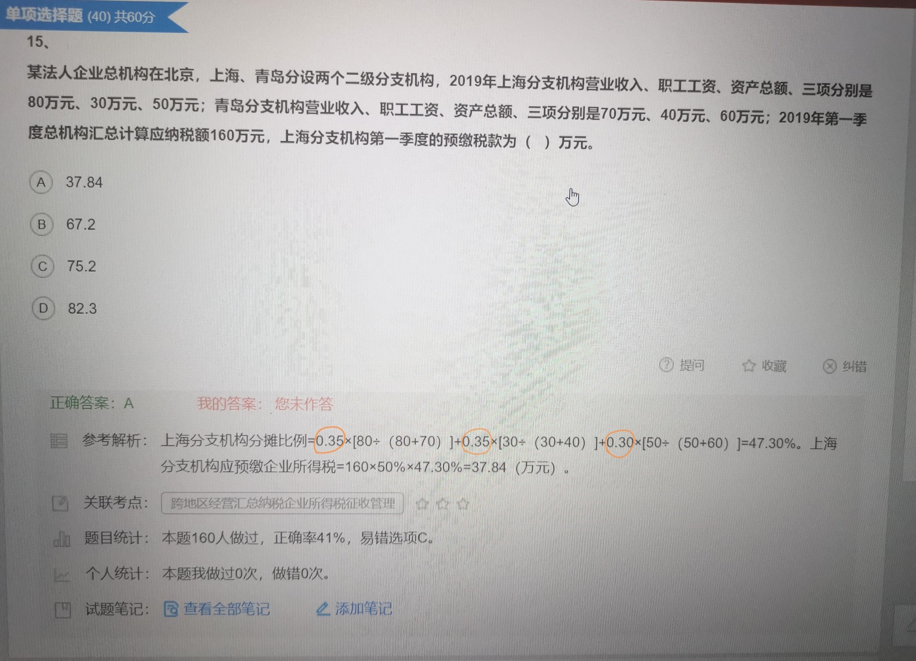 这里是汇总缴纳,税款要按照上述公式分摊,根据三项数据加权计算,根据公式套入数字计算即可,需要记住税款的50%50%的分配以及三项资产的分摊权重。