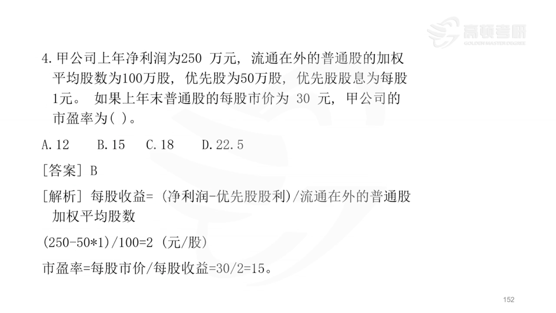 同学你好,你的公式大部分时间是适用的,但是如果像这种存在优先股股利的时候,严谨版的市盈率公式,分母的每股利润就等于第二张图片那样,用净利润-优先股股利/普通股股数