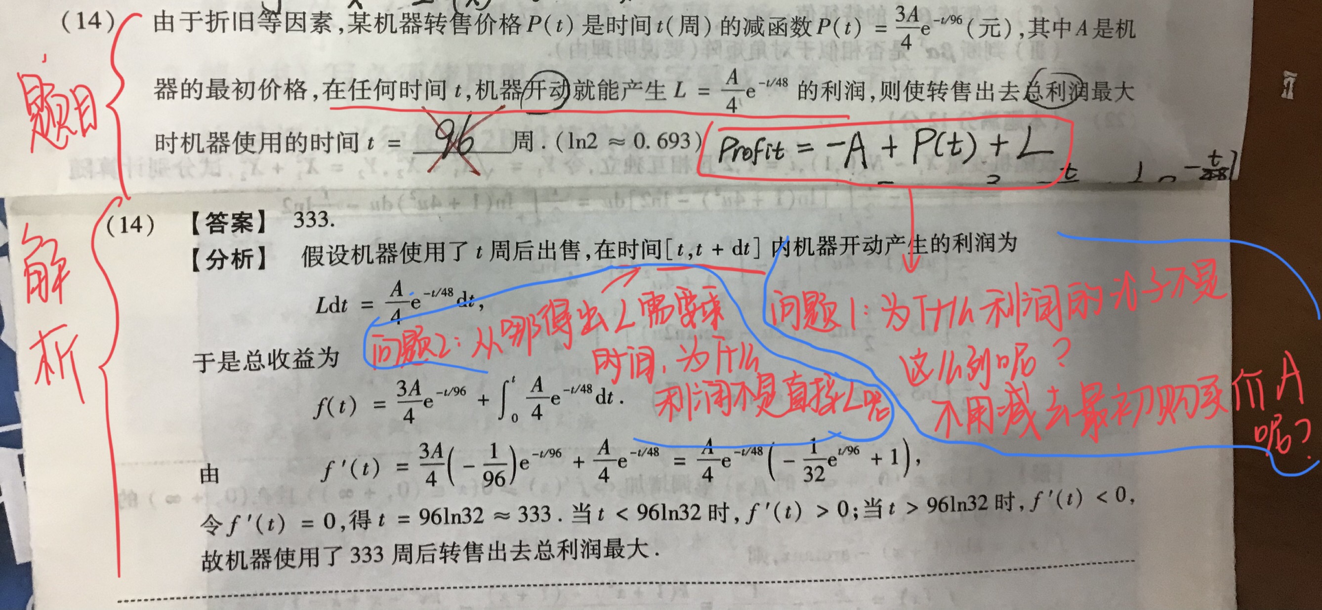 第二个问题,这个地方确实没有明确的说要乘时间。不过咱仔细观察这个利润的函数是:A/4exp(-t/48)