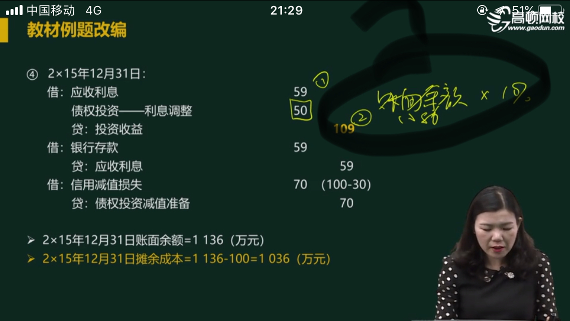 因为2015年的投资收益是根据2014年年末的情形决定的。2014年末的减值属于第二阶段尚未实际发生减值,所以仍然用账面余额乘以实际利率,这里的账面余额是1086,乘以利率之后得到的是108.6。