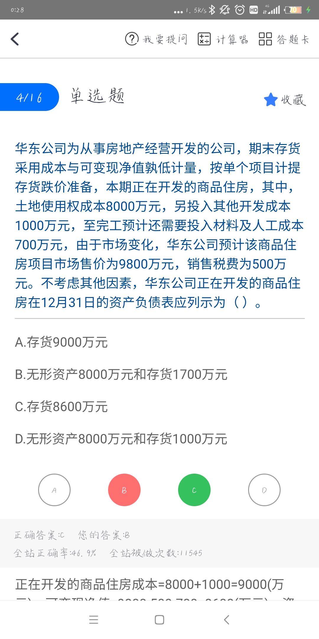 正在开发的商品住房成本=8000+1000=9000(万元),可变现净值=9800-500-700=8600(万元),账面价值9000大于可变现净值8600,发生了减值,资产负债表上存货=9000-备抵科目(即减值准备)=8600万元。