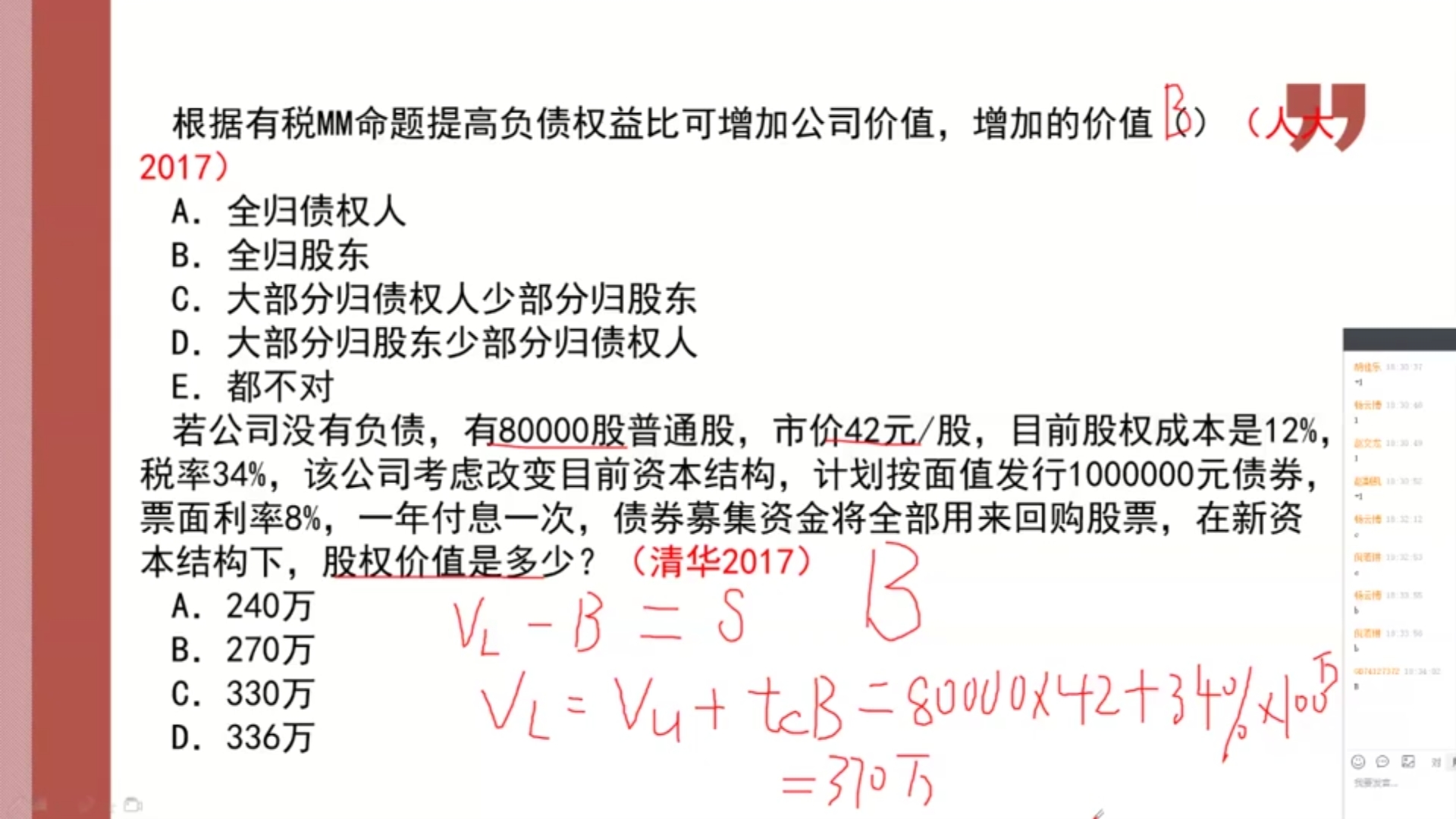 后面一题的税盾是先借债再回购,借债即企业负债增加,负债增加利息支出增加,从而利息部分可以抵缴税款,要把负债增加的这部分利得加回来。