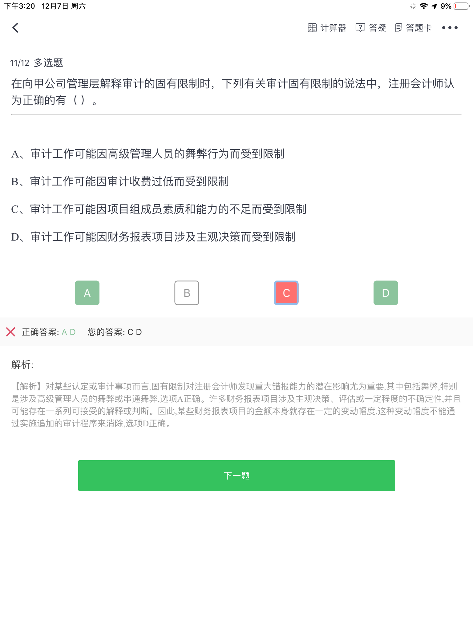 选项C为什么不正确?审计不就是要独立客观吗?...