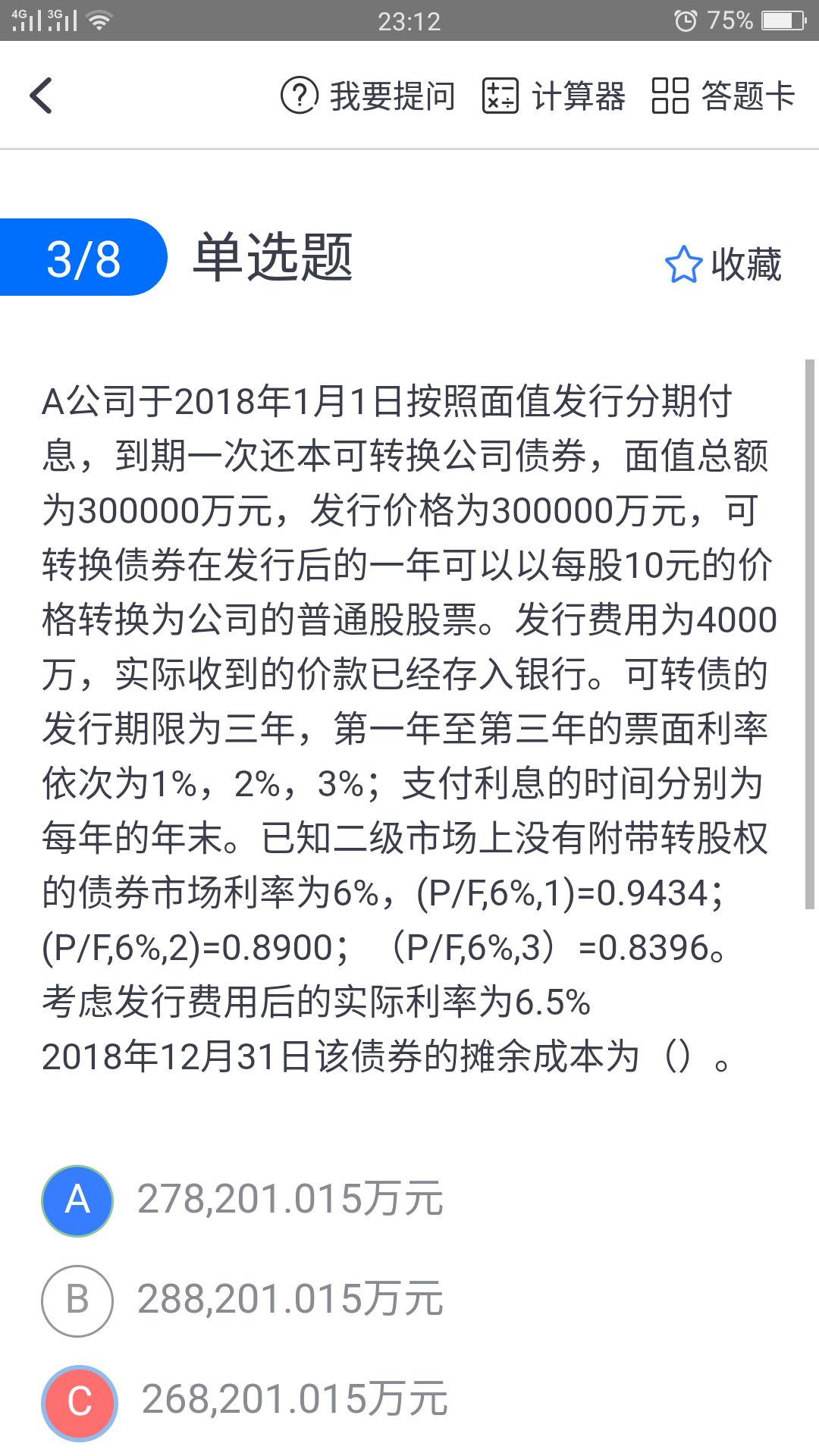 债券部分价值=300000*1%*(P/F,6%,1)+300000*2%*(P/F,6%,2)+(300000*3%+300000)*(P/F, 6%, 3)=267606.6