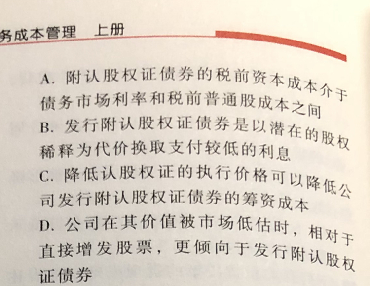 比如:股票实际上值50元每股,但是市场价格是20元,如果发行股票筹资,一股只能筹集20元,企业就亏了30元,所以企业会选择发行认股权证。